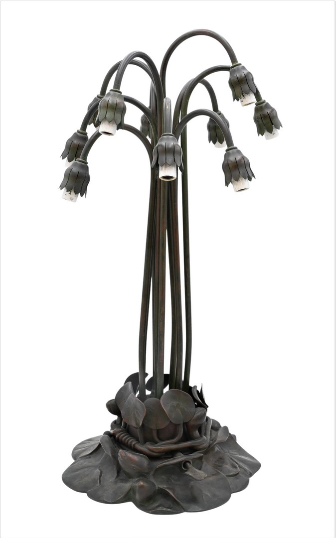 painted bronze lily pad form base having 10 arms, base marked Tiffany Studios, New York, 381, no shades
