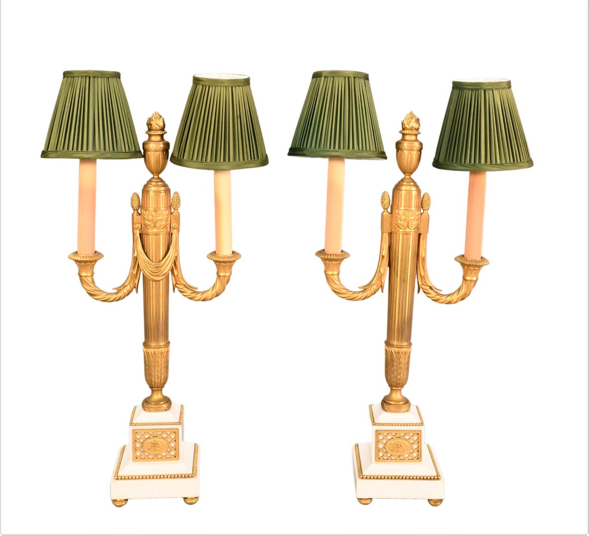 A Pair of Directoire Style Twin Light Candelabra Ormolu and White Marble Mounted Lamps with Two Arms