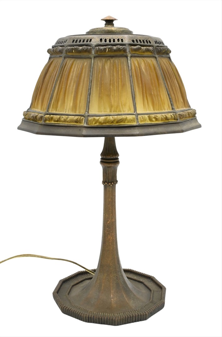 Tiffany Studios Gilt-Bronze and Favrile Glass Linenfold Desk Lamp