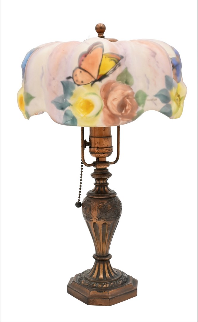 Pairpoint Reverse Painted Glass Butterfly and Roses Puffy Boudoir Lamp