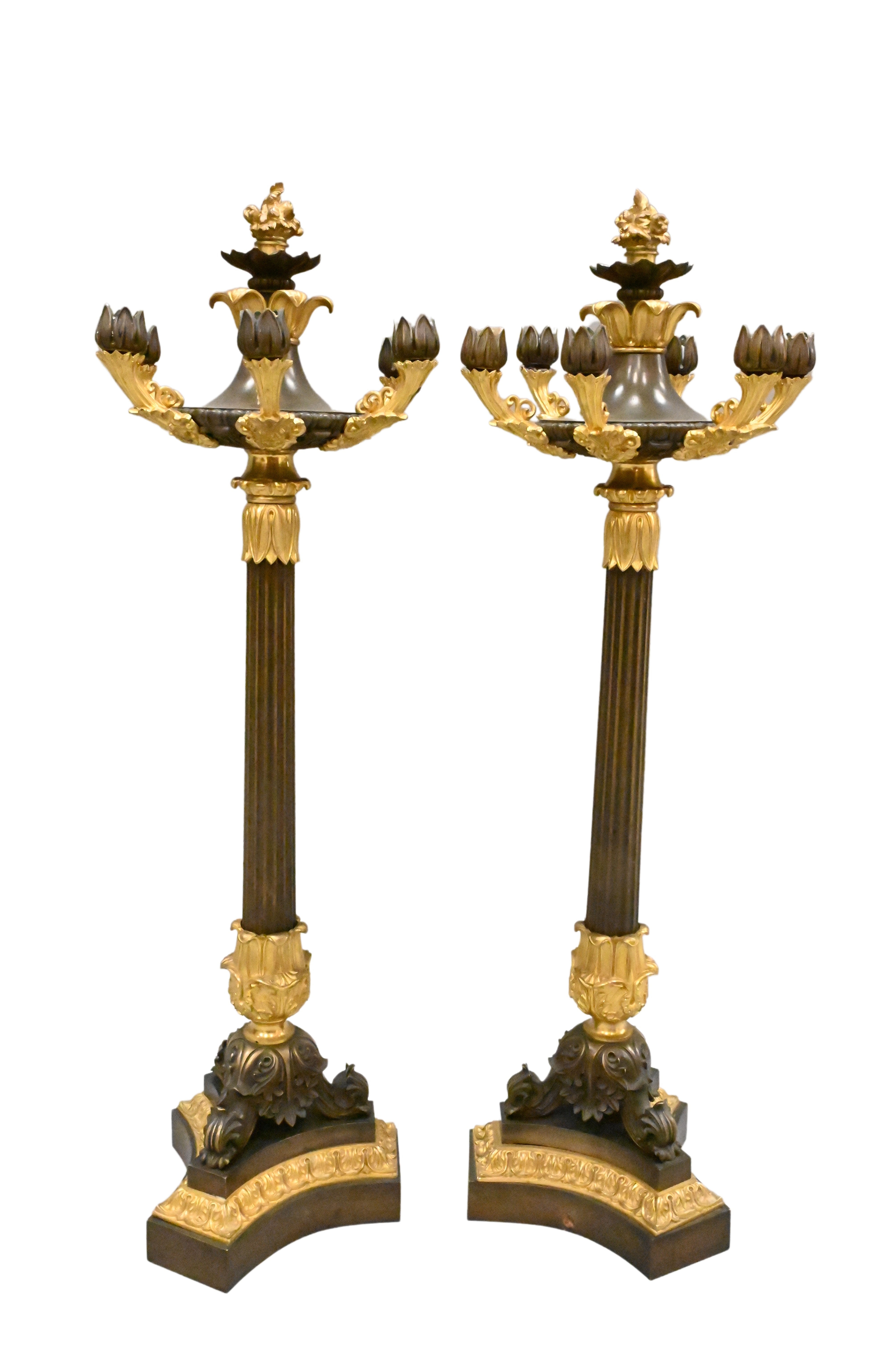 Two Similar Pairs of French Empire Ormolu and Bronze Five Light Candelabras