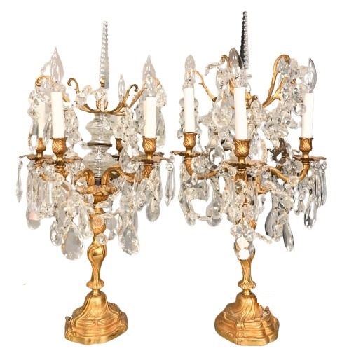 A Pair of Rococo Style Dore Bronze and Cut-Glass Five-Light Candelabras