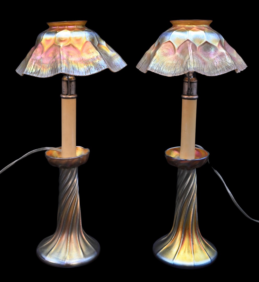 iridescent gold with pink highlights, candle style base having twisted bulbous iridescent gold base, marked LCT on bottom
