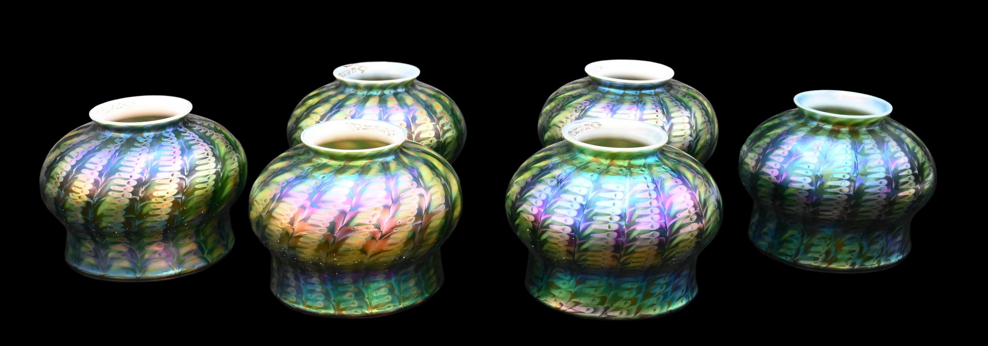 decorated with a zipper pattern, lined in opal glass, iridized, on a flower-form base