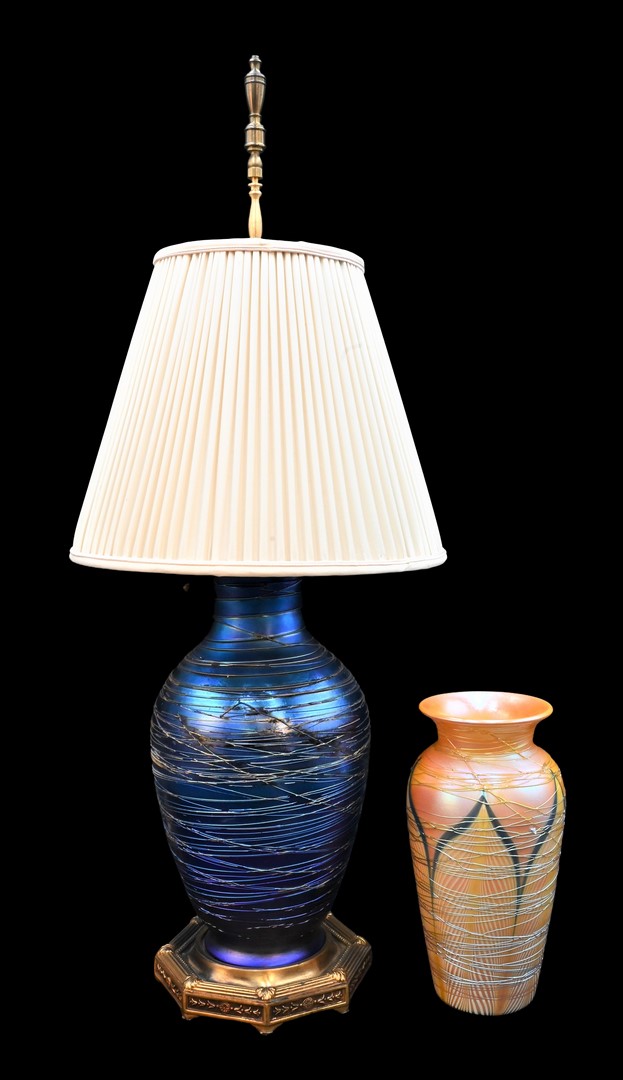 to include a large purple/blue iridescent having threaded overlay, made into a table lamp