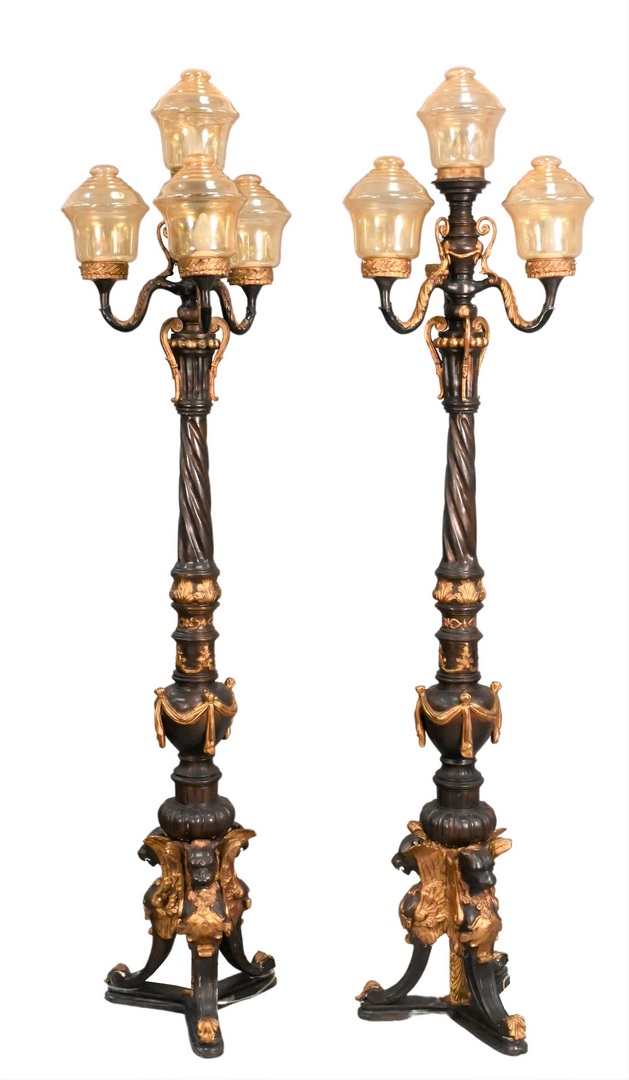 alongside a pair of five-light bronze candelabra on figural supports, on grey marble bases