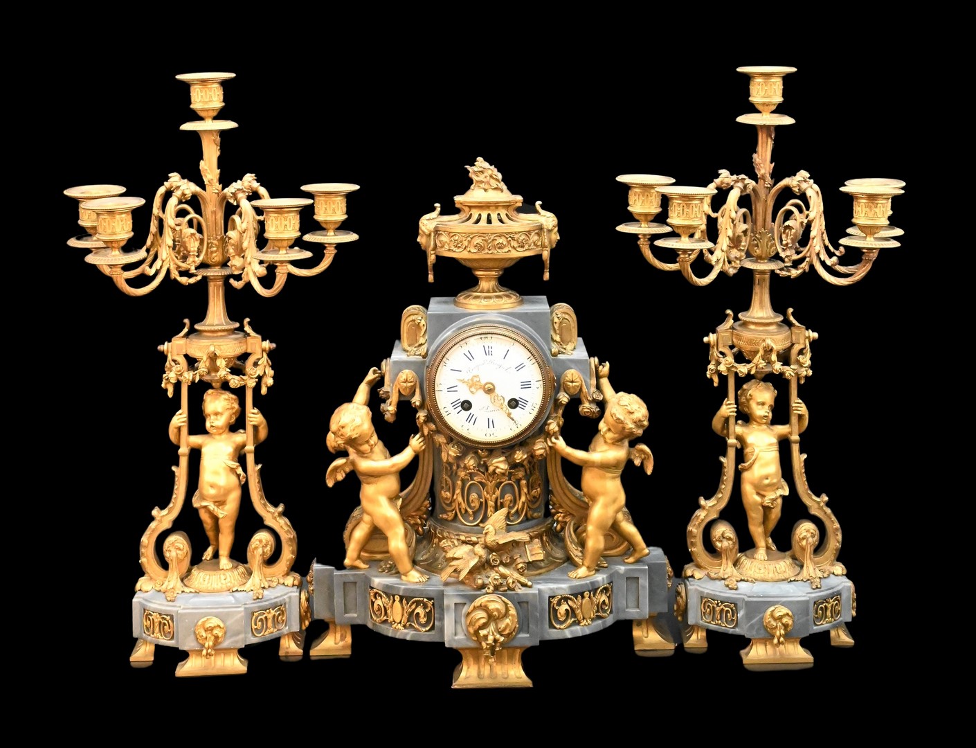 French Grey Marble and Gilt Bronze Figural Three-Piece Clock Set