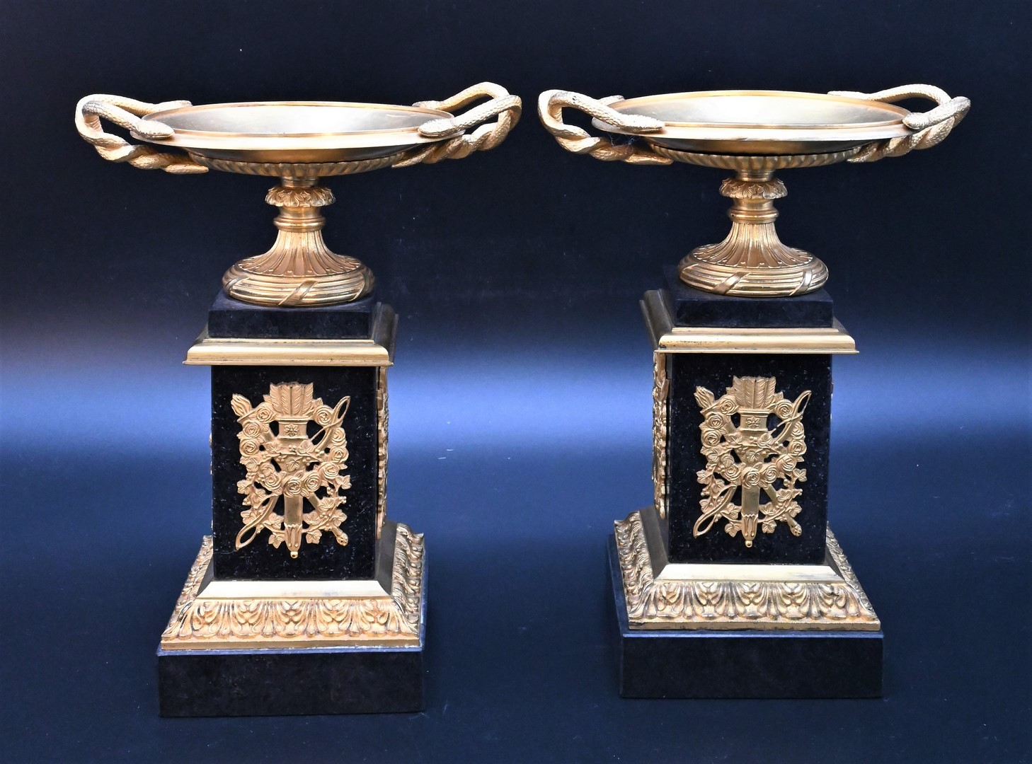 each with shallow bowl having applied double entwined snake handles above a waisted socle, raised on a plinth with applied ormolu military trophies, having waterleaf-molded plinth