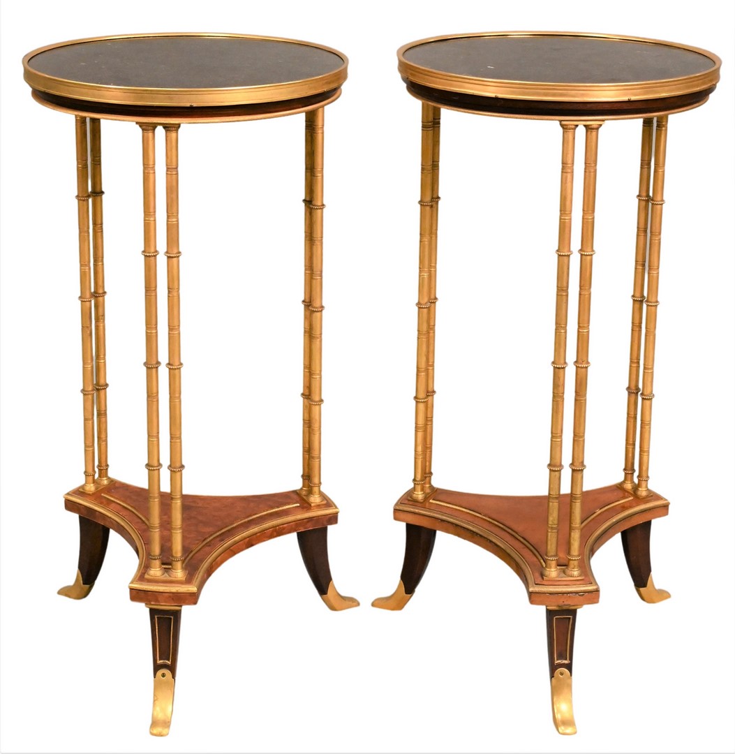 A Pair of Louis XVI Style Bronze Ormolu and Burl Maple Gueridon A Doubles Colonnettes Tables