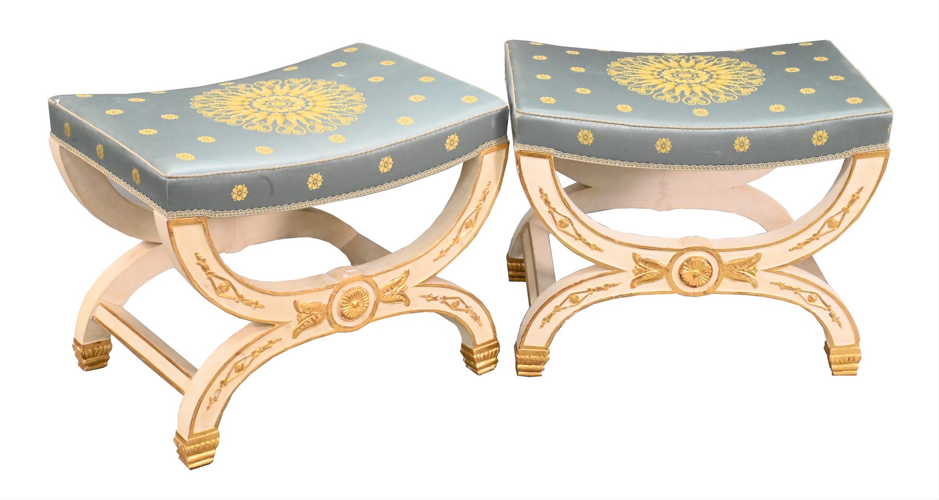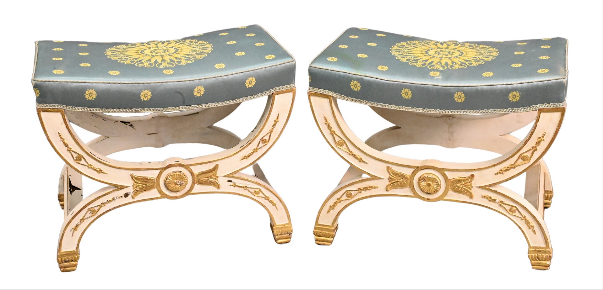 A Pair of Neoclassical Style Parcel-Gilt White Painted Tabourets