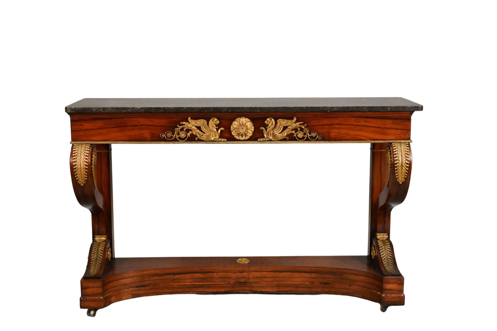 rectangular Belgian marble top above a frieze, mounted with winged griffins centering a rosette, raised on scrolled supports affixed to rectangular upright and joined by a concave stretcher, on casters, the scrolls applied with foliage