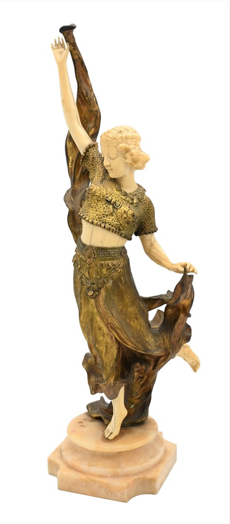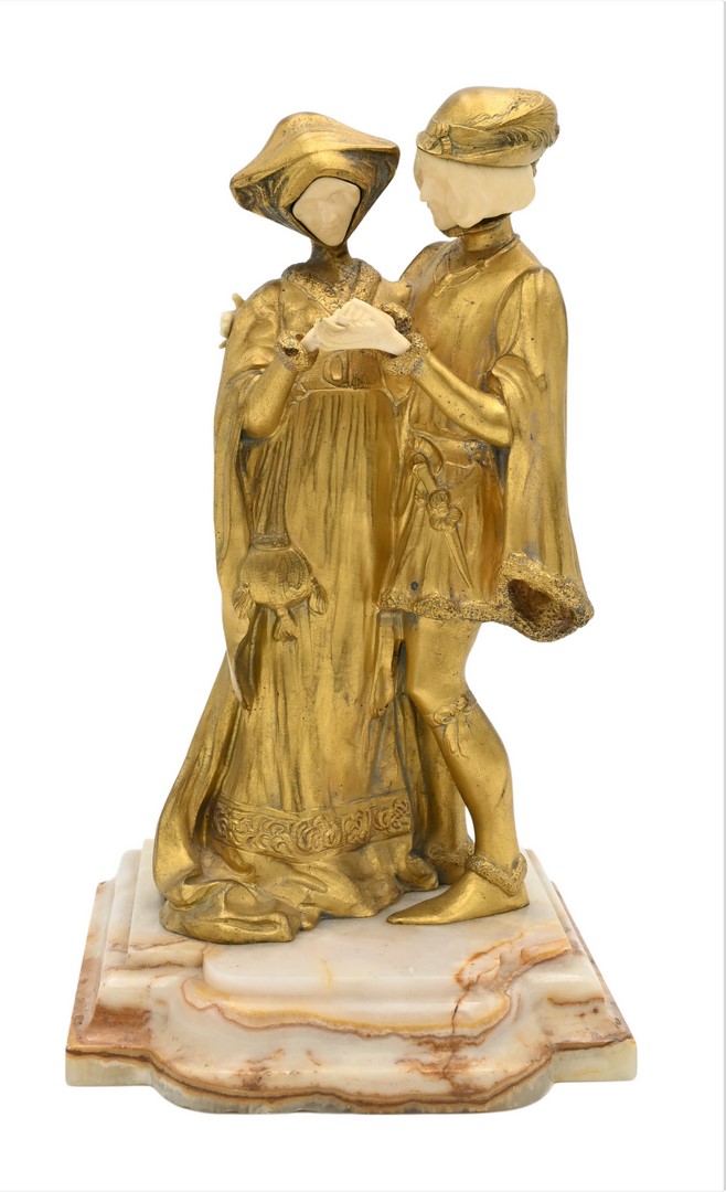 courtly lovers in late medieval costume, gilt bronze on onyx base, signed on back of dress L. Sosson