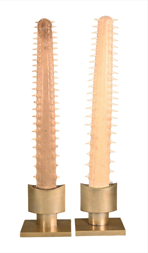 a pair of large taxidermy sawfish bills, mounted on brass base