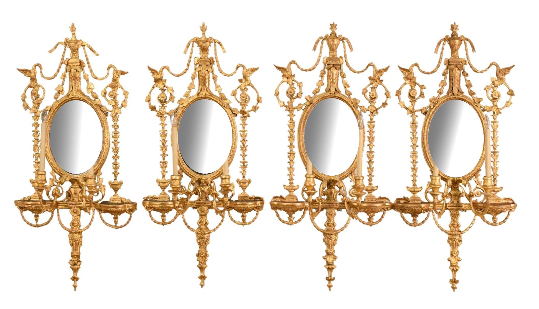 A Set of Four Continental Giltwood and Composition Twin-Light Girandole Mirrors