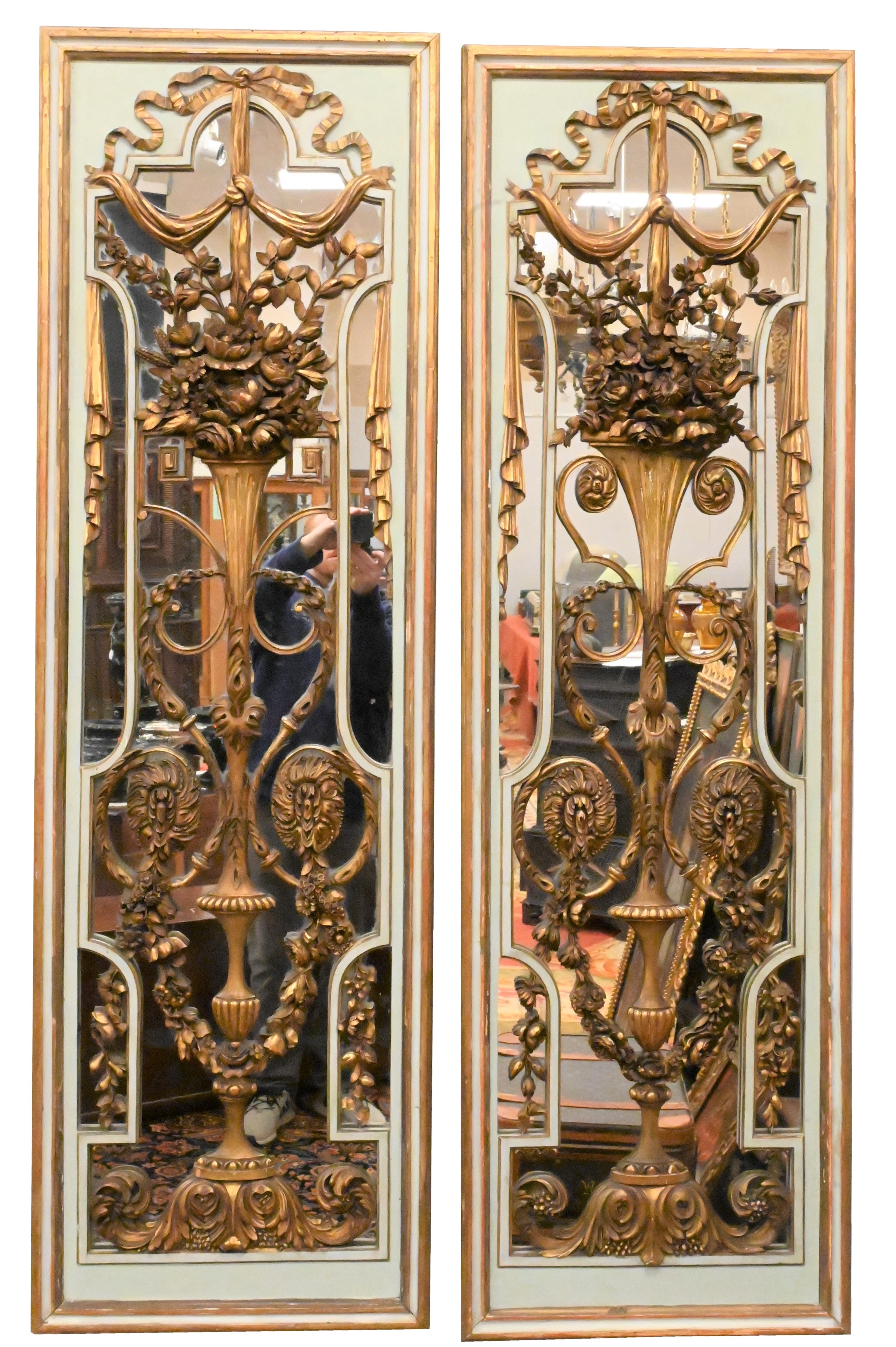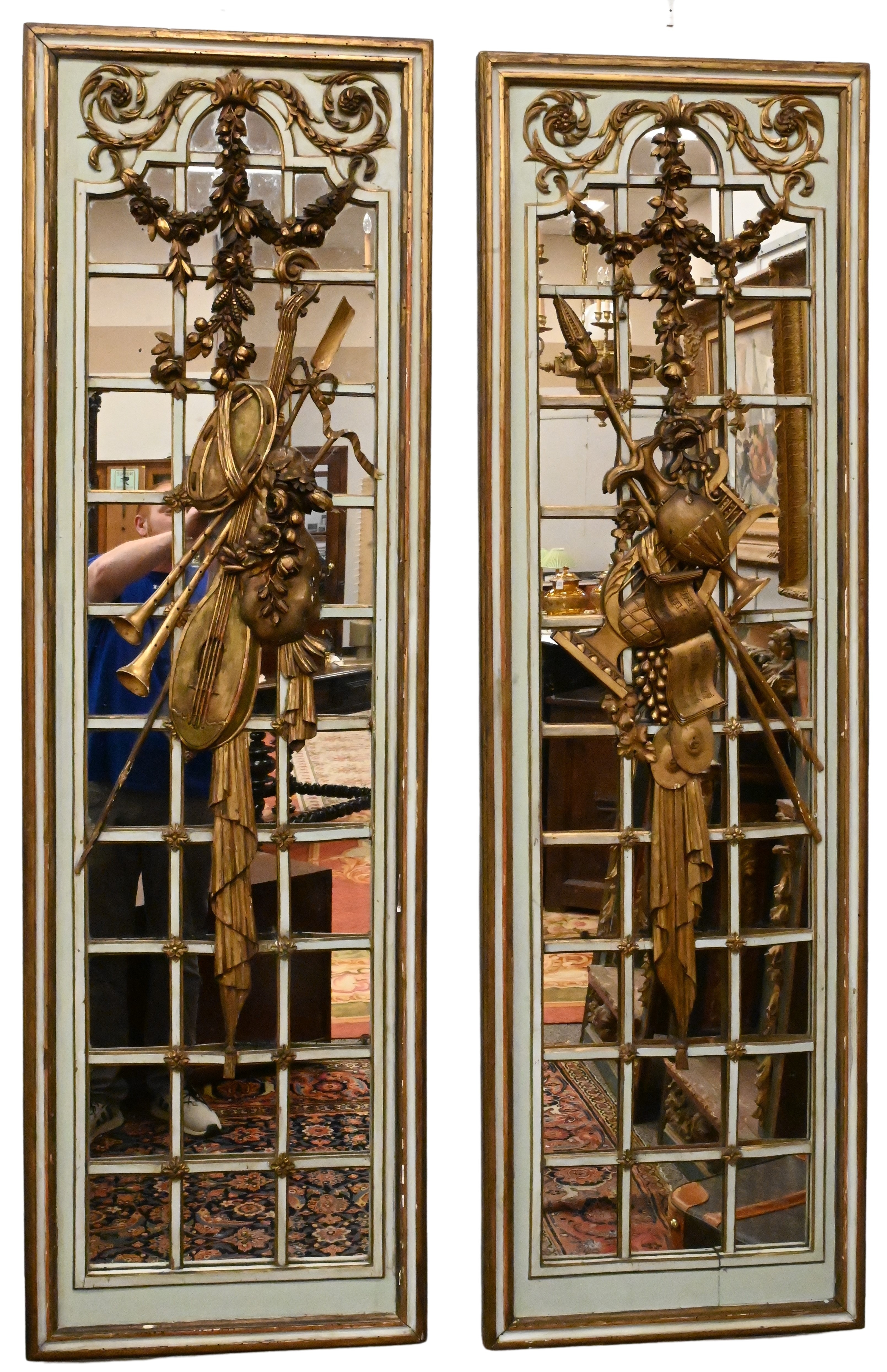 carved giltwood, light blue and white painted center decorated with classical instruments and mirrored backs