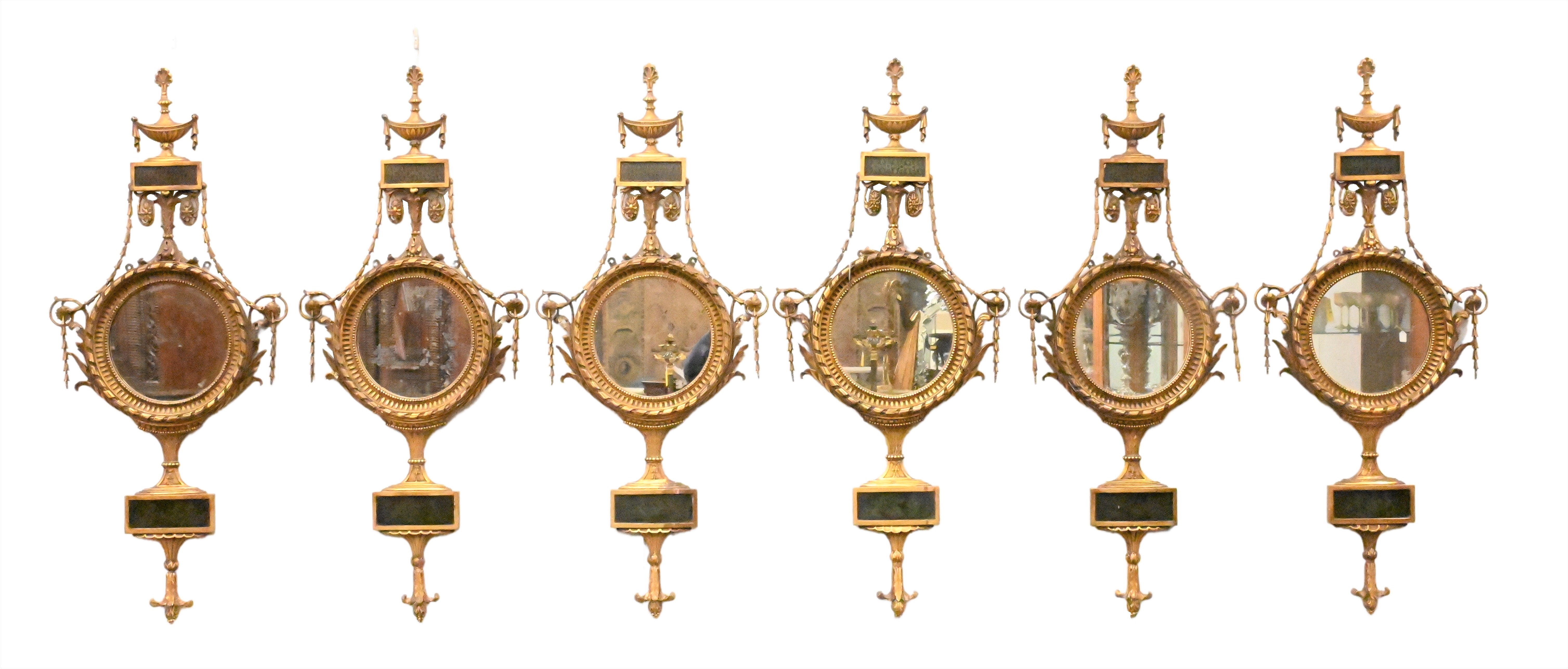 Condition: Overall good condition, a pair of mirrors with considerable sun fading, all mirrors with edge chips, minor losses to gilding, repairs on each and to structure, two having separations to round outer frame