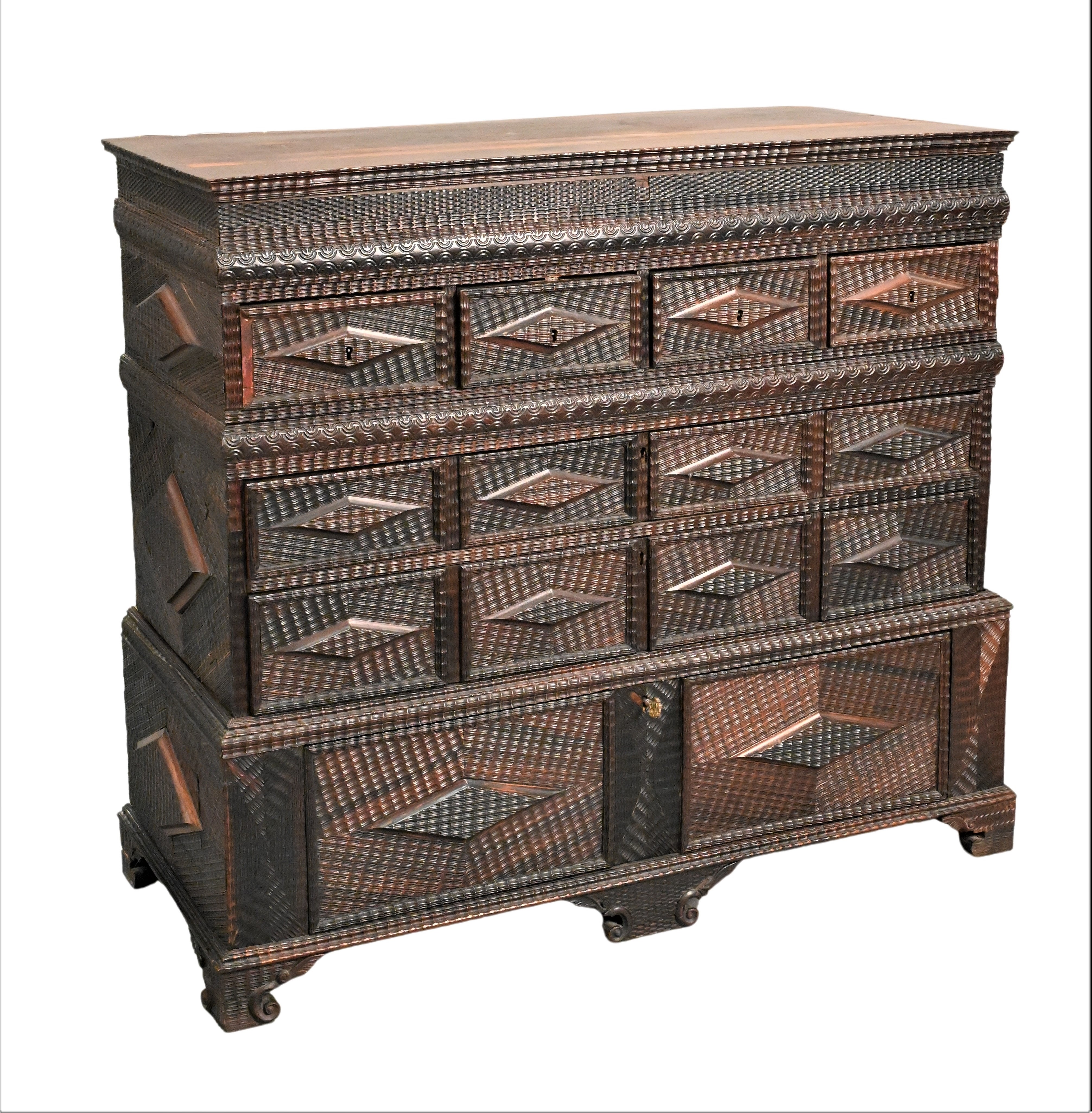 having rosewood rectangular lift top over various ripple and lattice carved ornaments and incorporating four short over two graduated long drawers, pull out writing slide with interior small drawers, base with large drawer and bracket feet, 19th century, restored