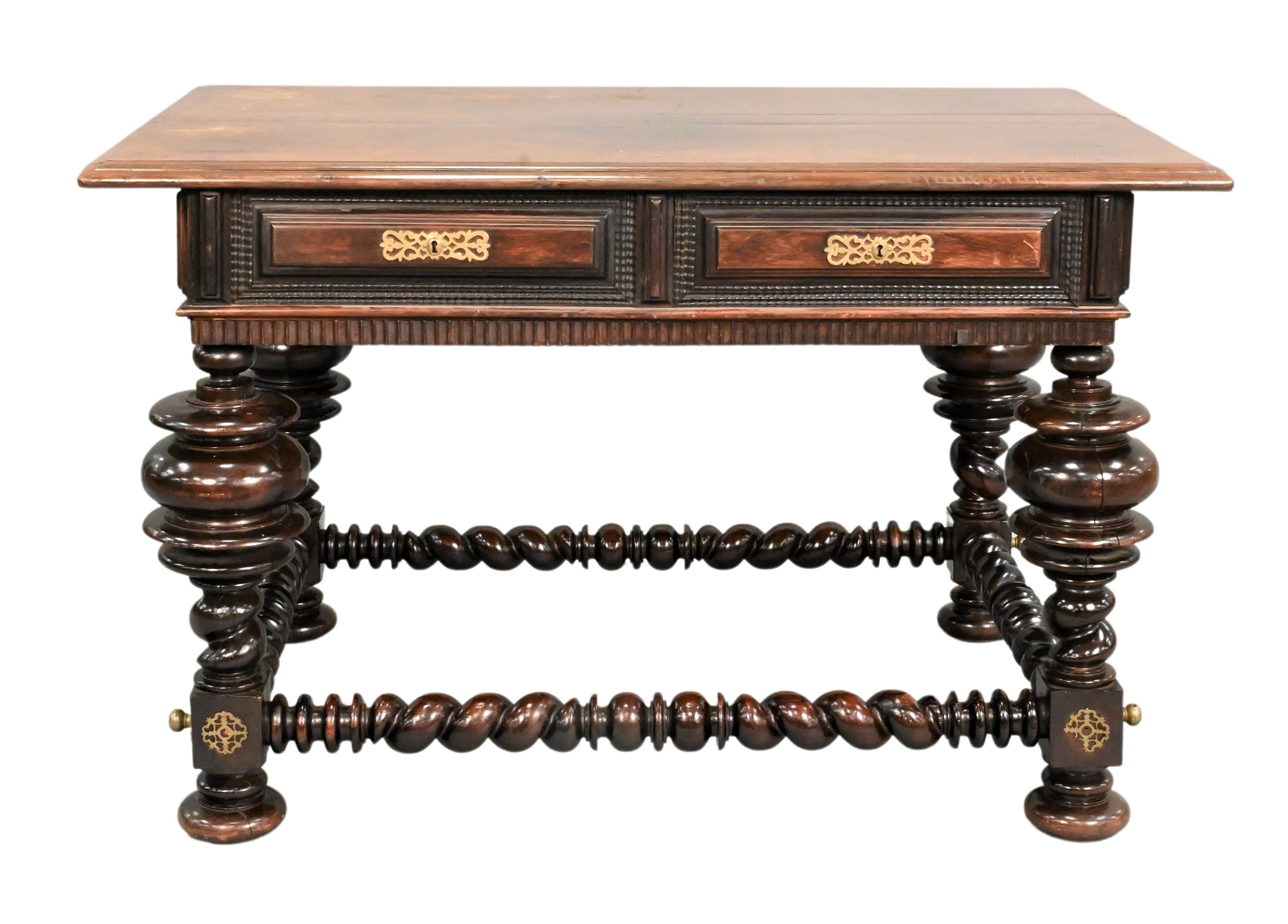 rectangular top having a molded edge over two frieze drawers carved with ripple panels, above a conforming apron and four large turned urn form legs joined by spirally-carved box stretcher, 18th century