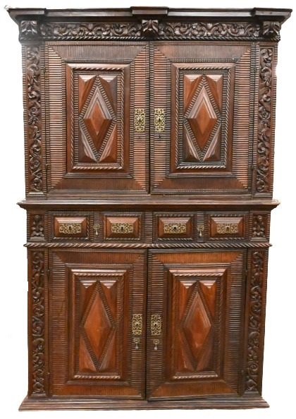 in two parts, the upper having a stepped molded pediment over a leaf and twisted rope-carved frieze, above a pair of doors inset with carved diamond panels and rippled carving, the later portion with two frieze drawers, each having two rectangular panels above two diamond-inset lower doors raised upon a plinth base, all with ripple molded fronts, top interior made into television cabinet, 18th century, restored