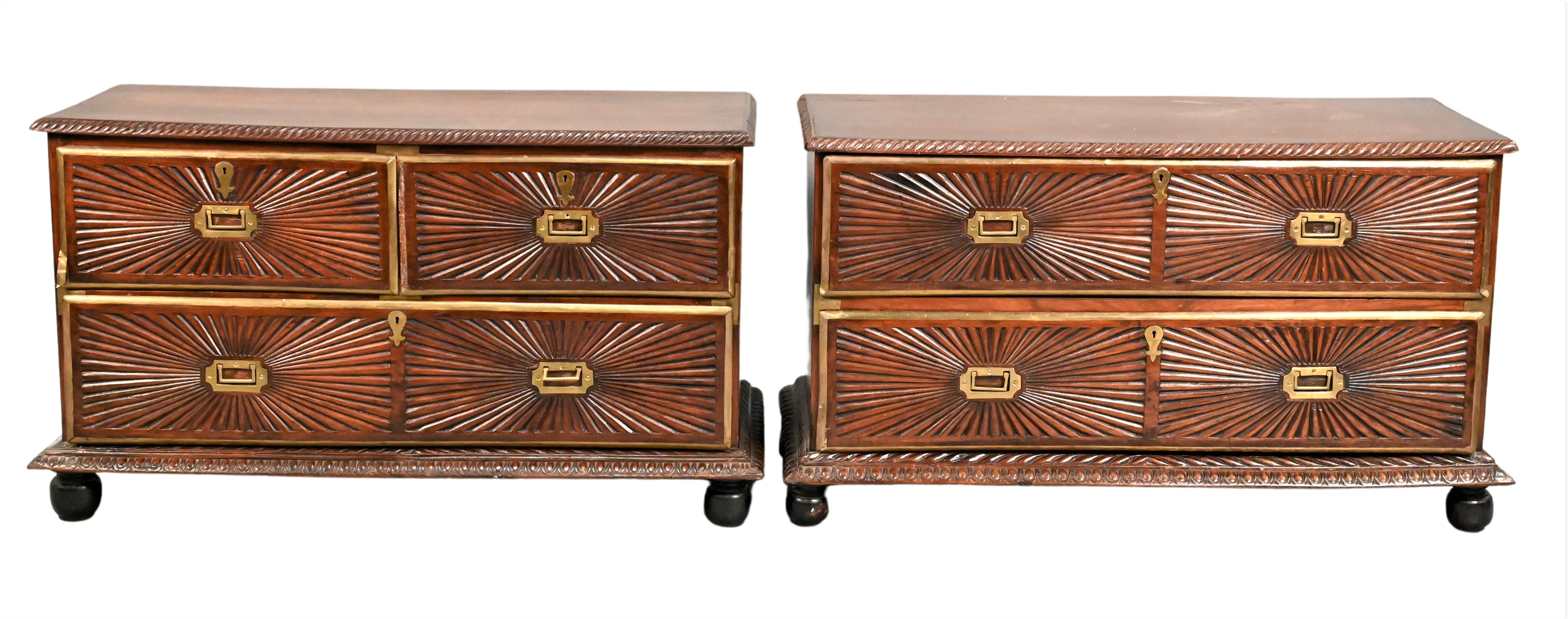 in two parts, each with gadrooned edge, one with two long drawers, the other two short over single long drawer, 19th century