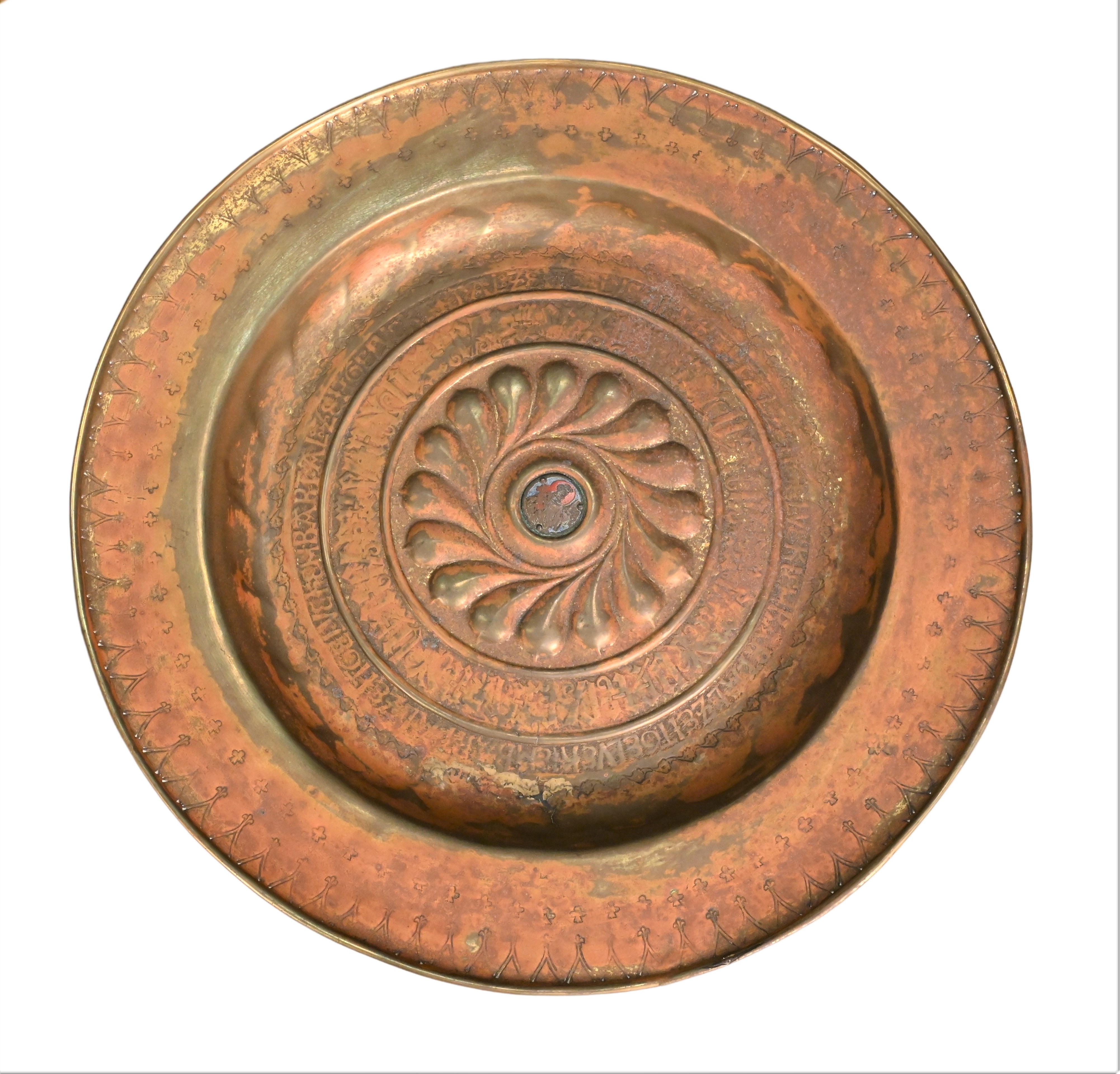 large alms dish, 16th century or later with enameled center cartouche