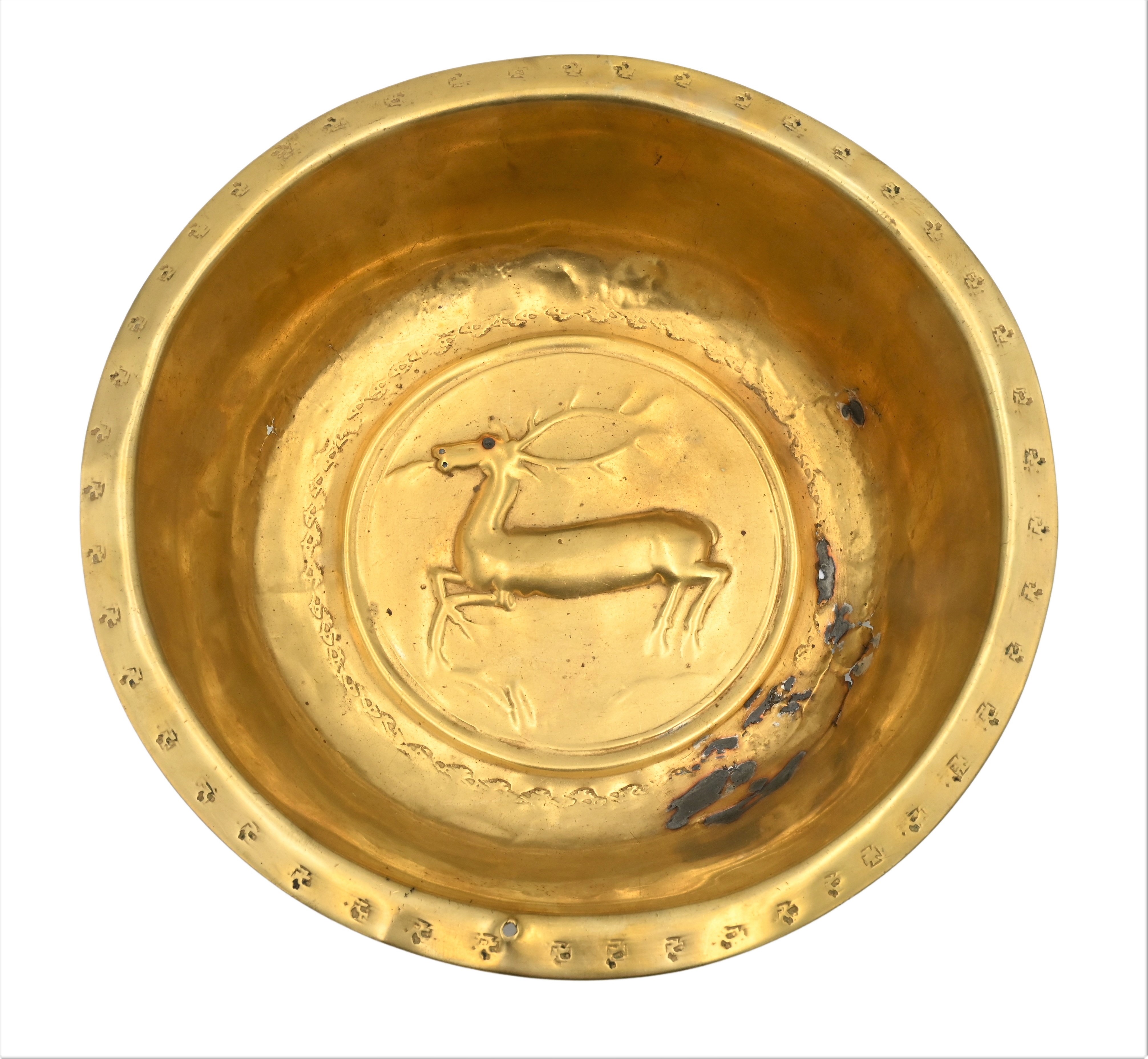 having embossed deer in center, touch marks around rim
