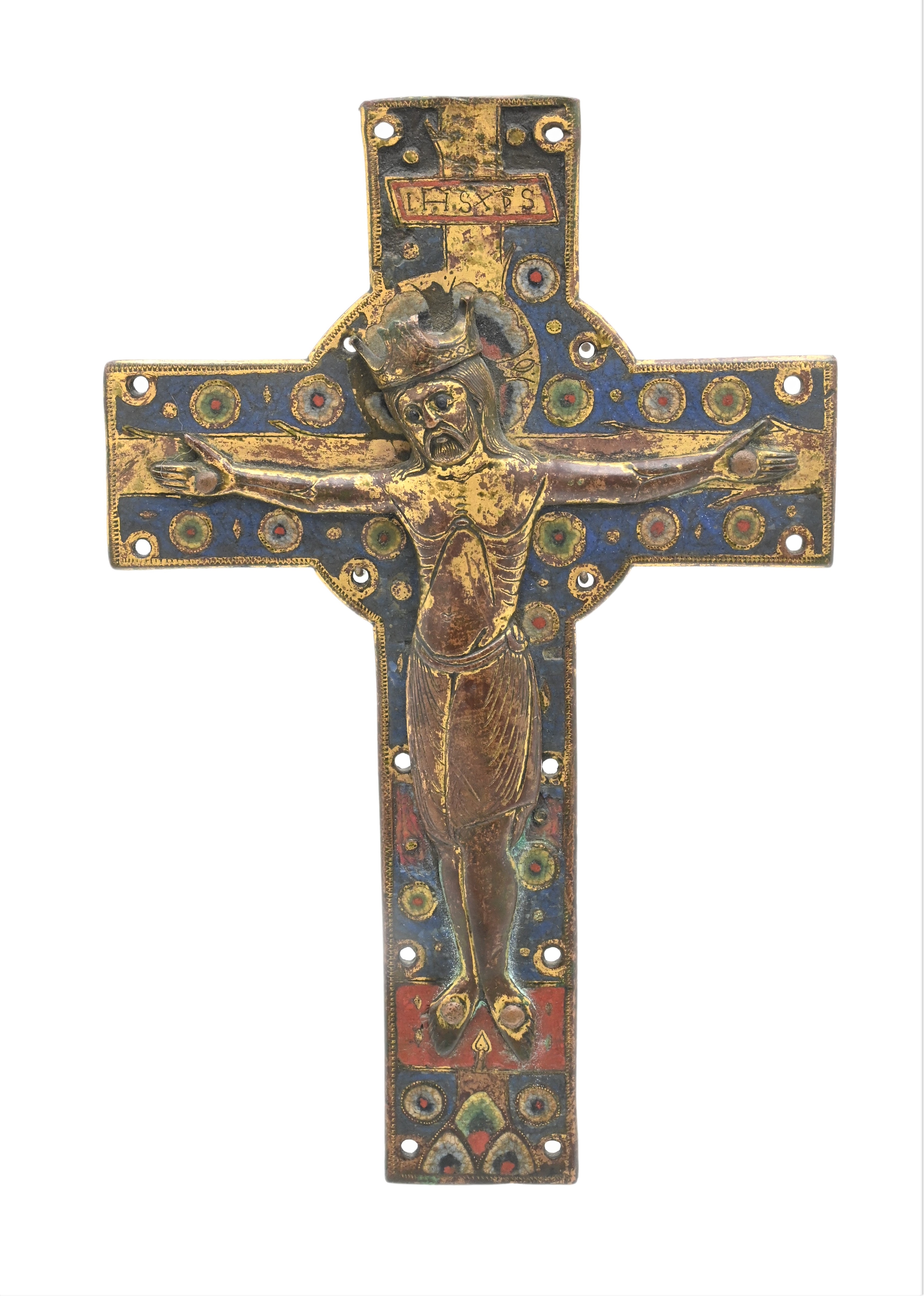 the applied corpus in high relief, which can be classified as belonging to the “Gem group” or “Type II” category referred to in Paul Thoby’s typology, the crowned figure of Christ in repousse copper with enameled decoration at eyes, perizonium and footrest, titulus inscribed IHS XPS, approximately 13th century