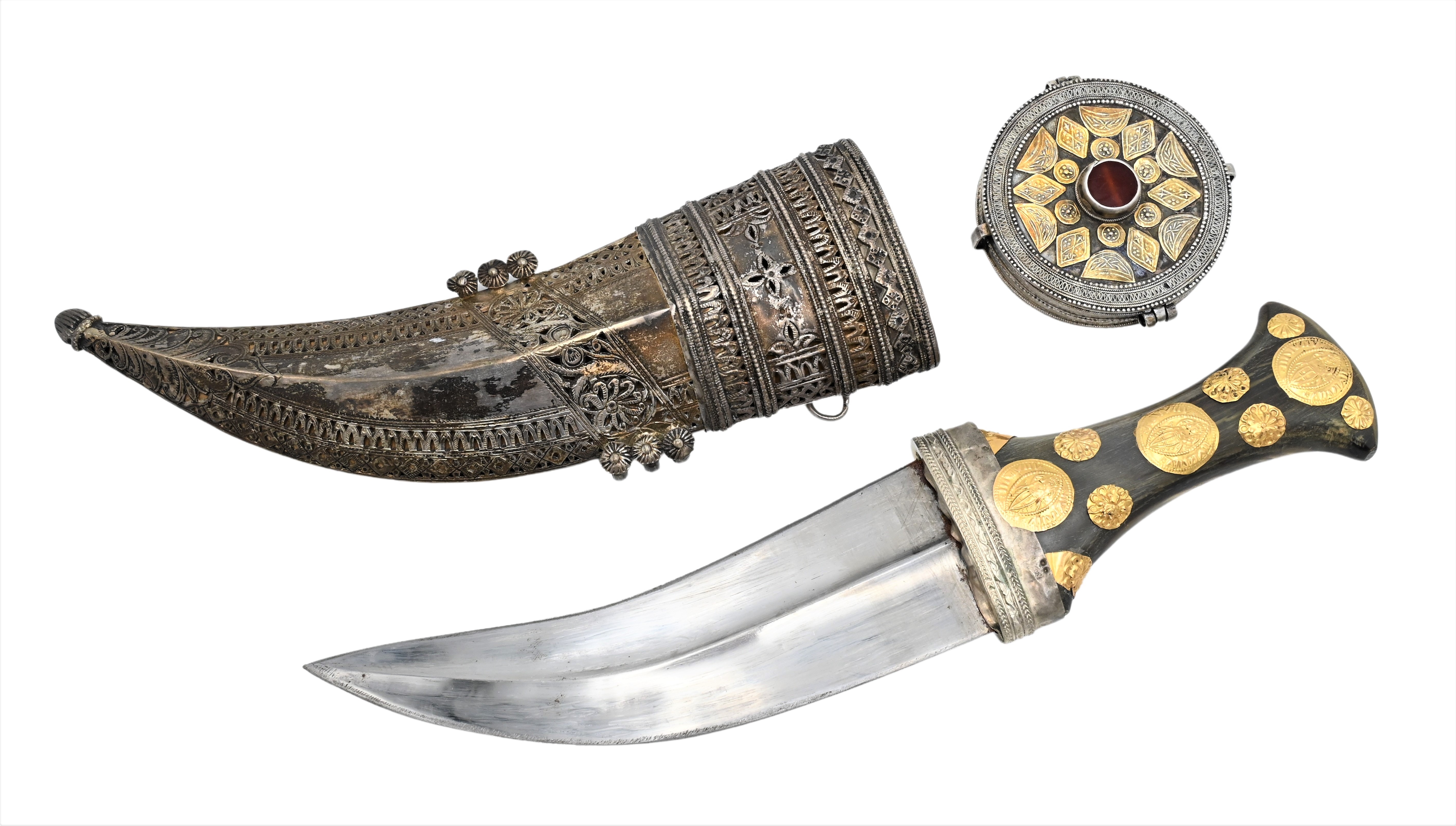 including presentation dagger, length 13 1/4 inches, having horn handle with silver sheath and gold applied faux coins