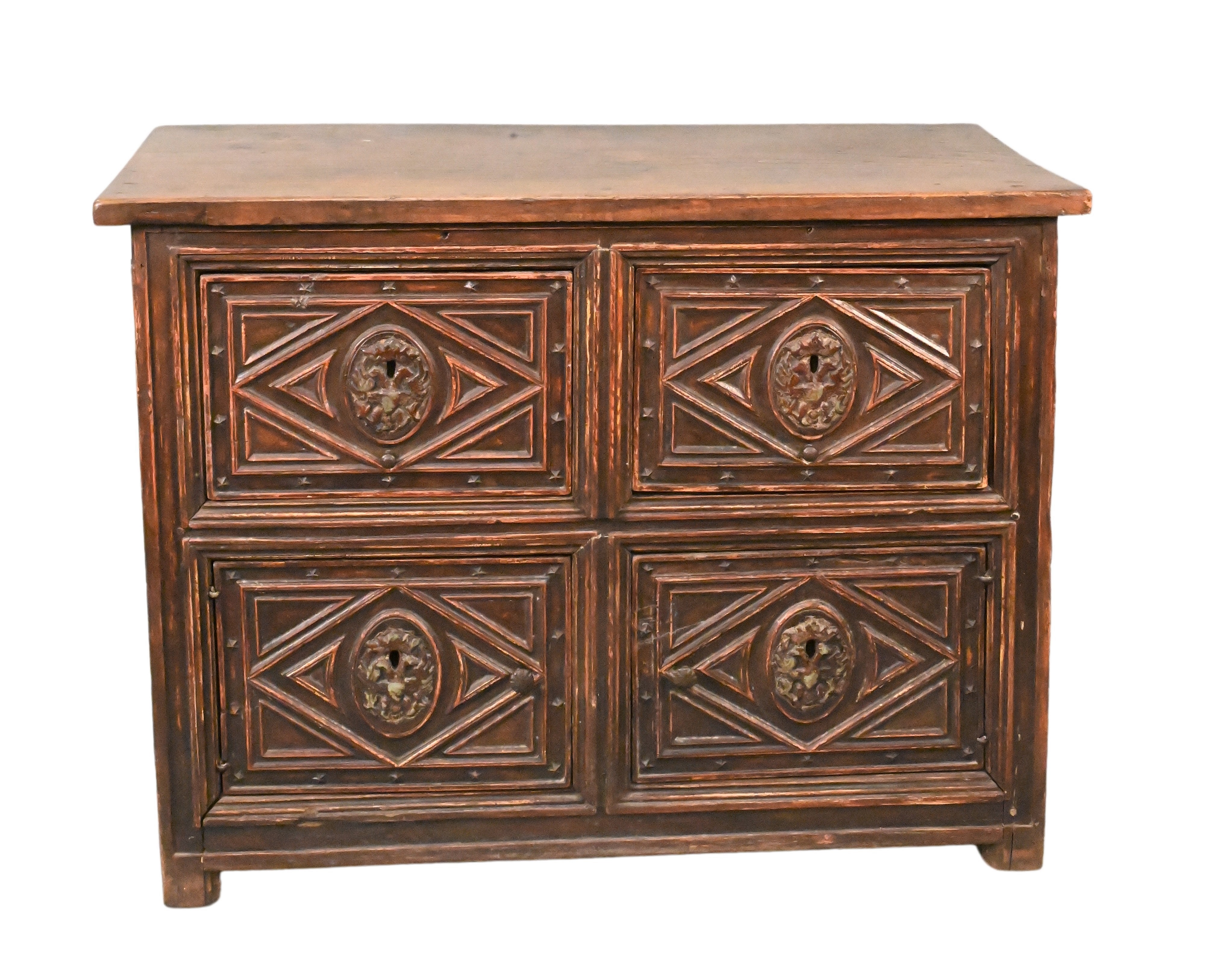 the rectangular top over two framed drawers, each with star surround and double central bird over two doors of same makeup