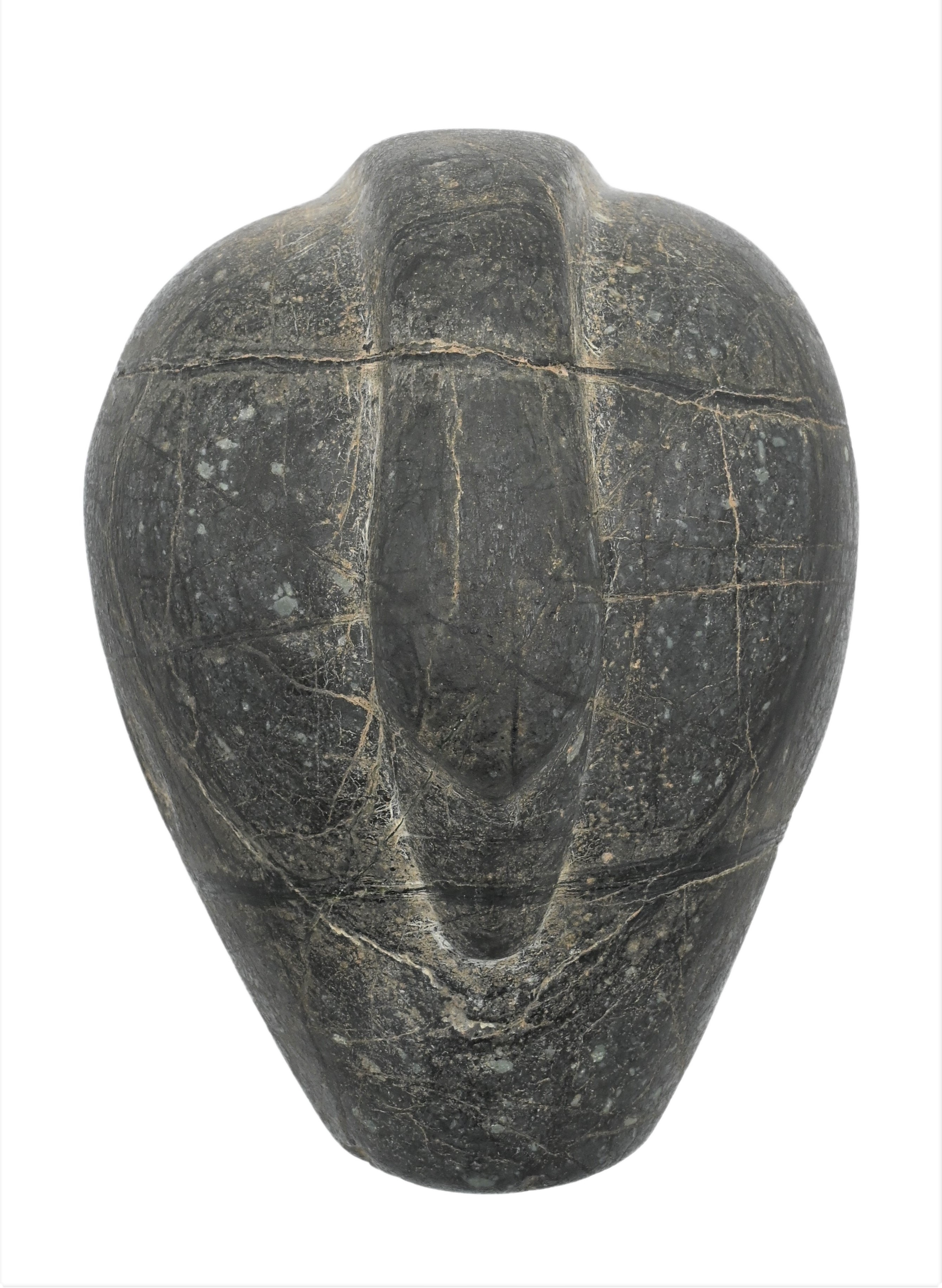 B.C. stone, weight in the form of a stylized duck, hand-carved from black basalt