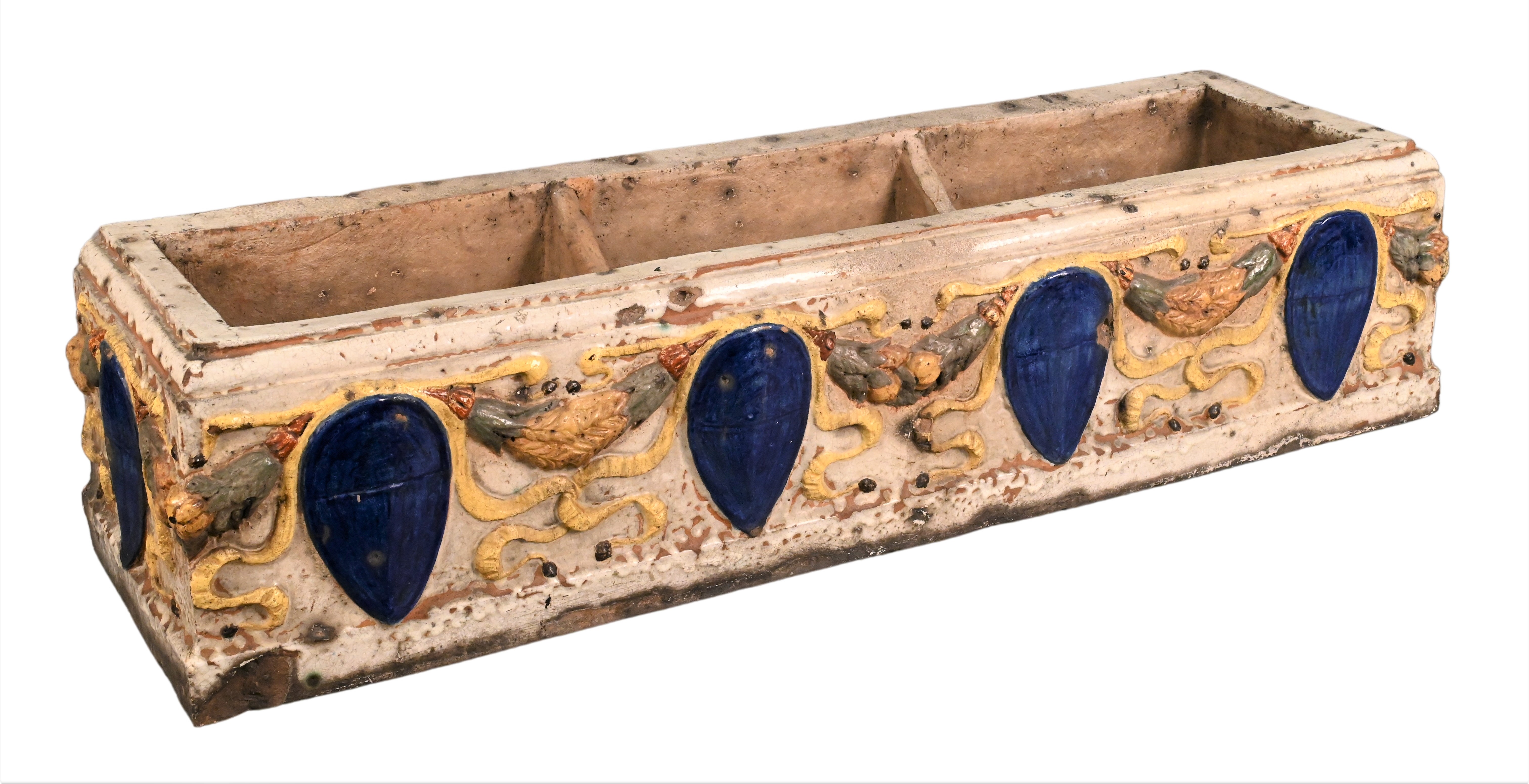 rectangle form with luster, cobalt blue glazed teardrop jewels with yellow and green wreath, white ground, interior divided into three sections, possibly 15th/16th century or later