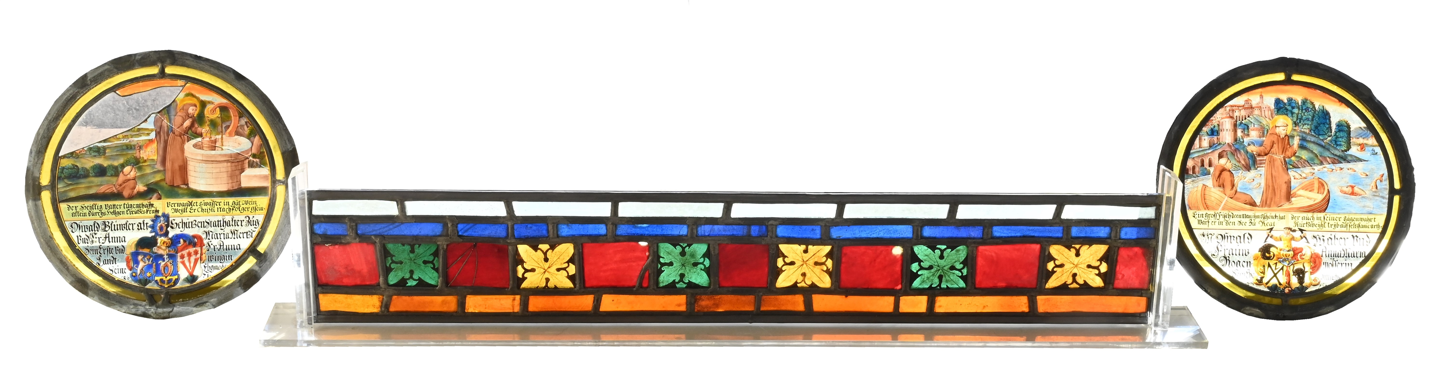 two stained glass roundels with landscape scenes, along with three rectangular pieces