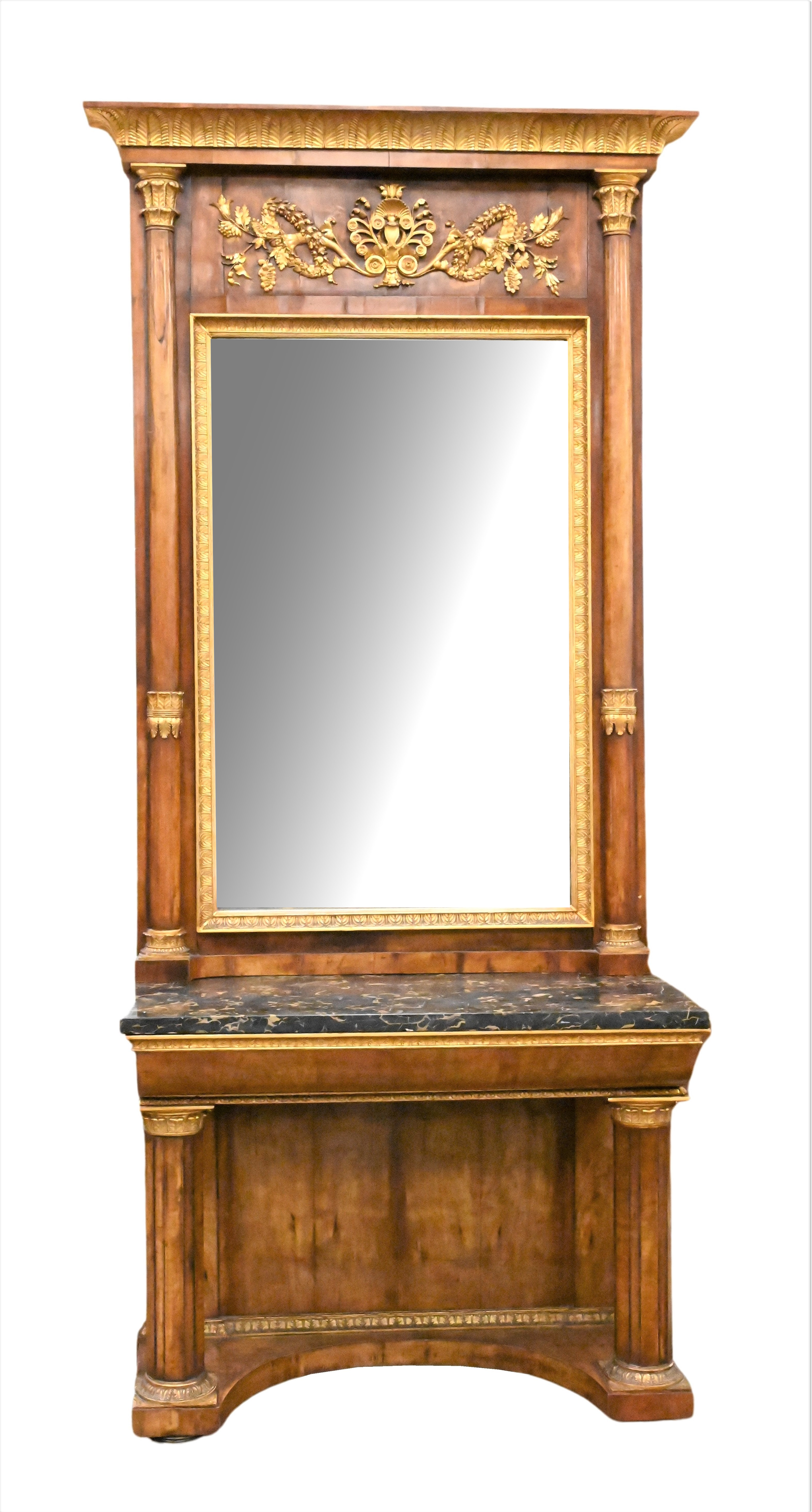 rectangular mirror flanked by columns over black marble top pier table column supports