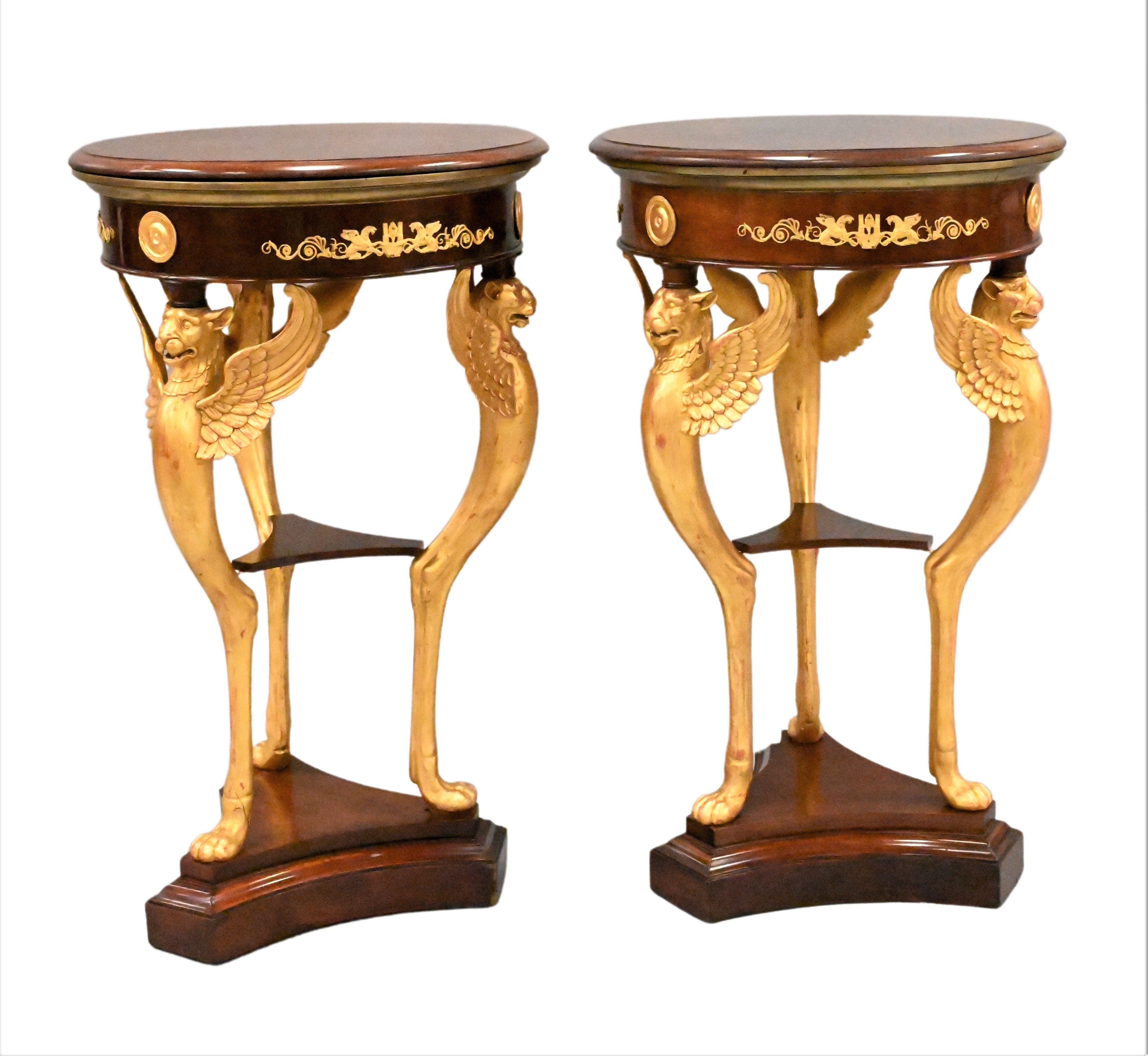 each having mahogany circular top above a conforming frize of applied sphinxes and boss mounts, raised on winged griffin monopodial united by a shaped medial shell, raised on a tripartite base