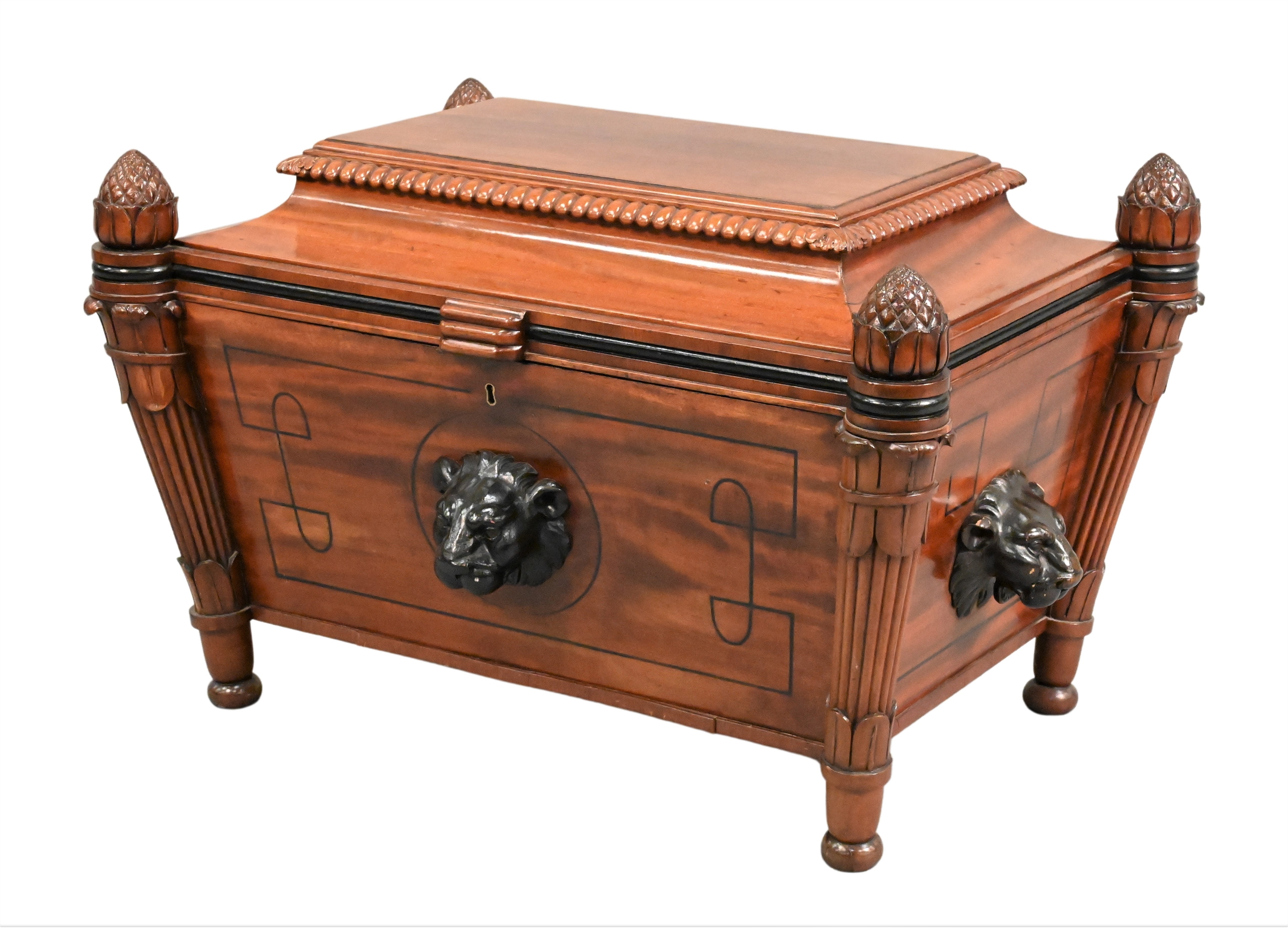 having rope carved trim with ogee molded hinged lid, on cabinet and supported by pine cone carved support with fluted and turned legs, three sides with 3D lion faces
