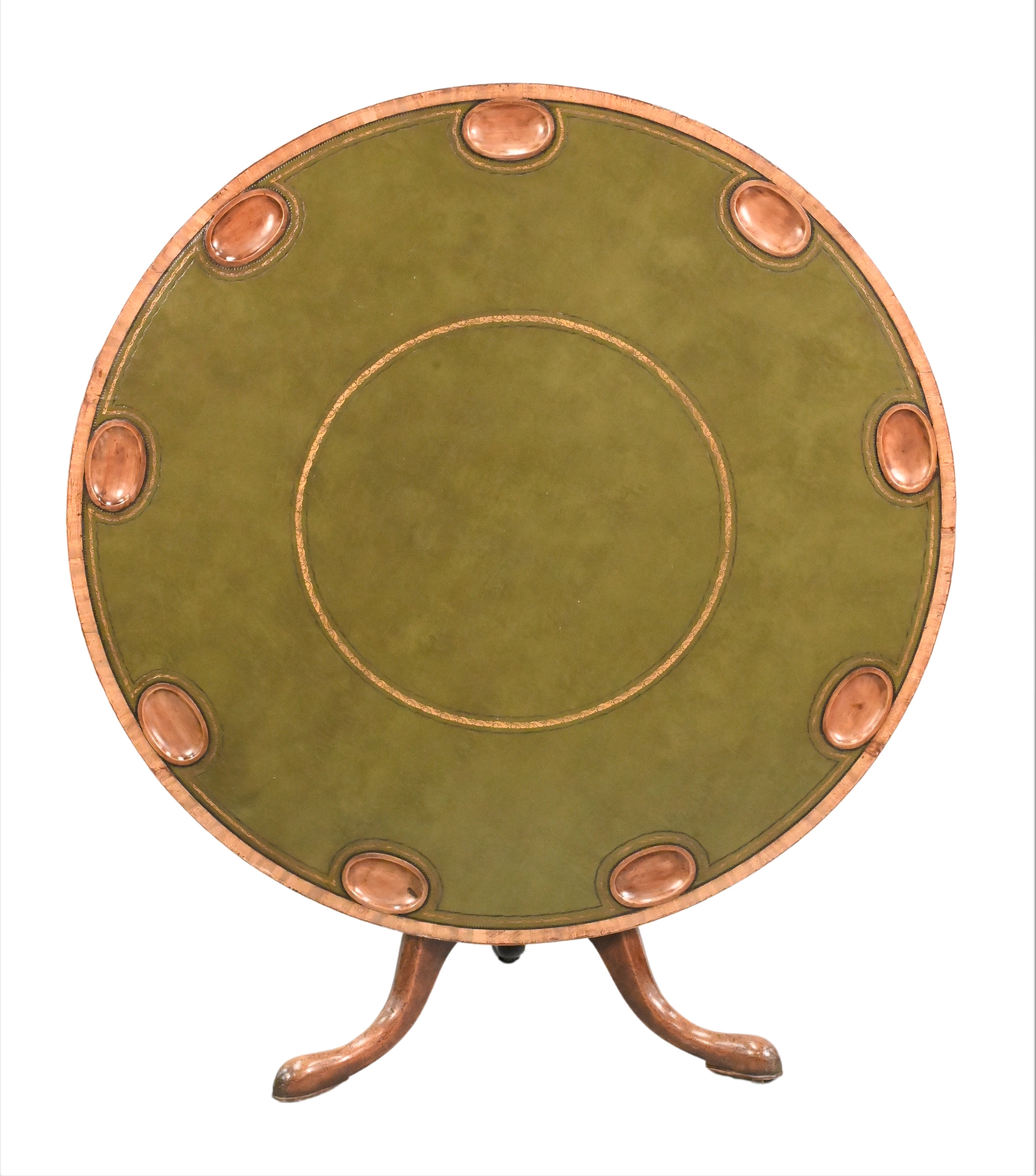 having gilt-tooled leather-inset circular top with nine money wells, tilting above a baluster-turned standard on cabriole legs ending in pointed pad feet, mid-18th century