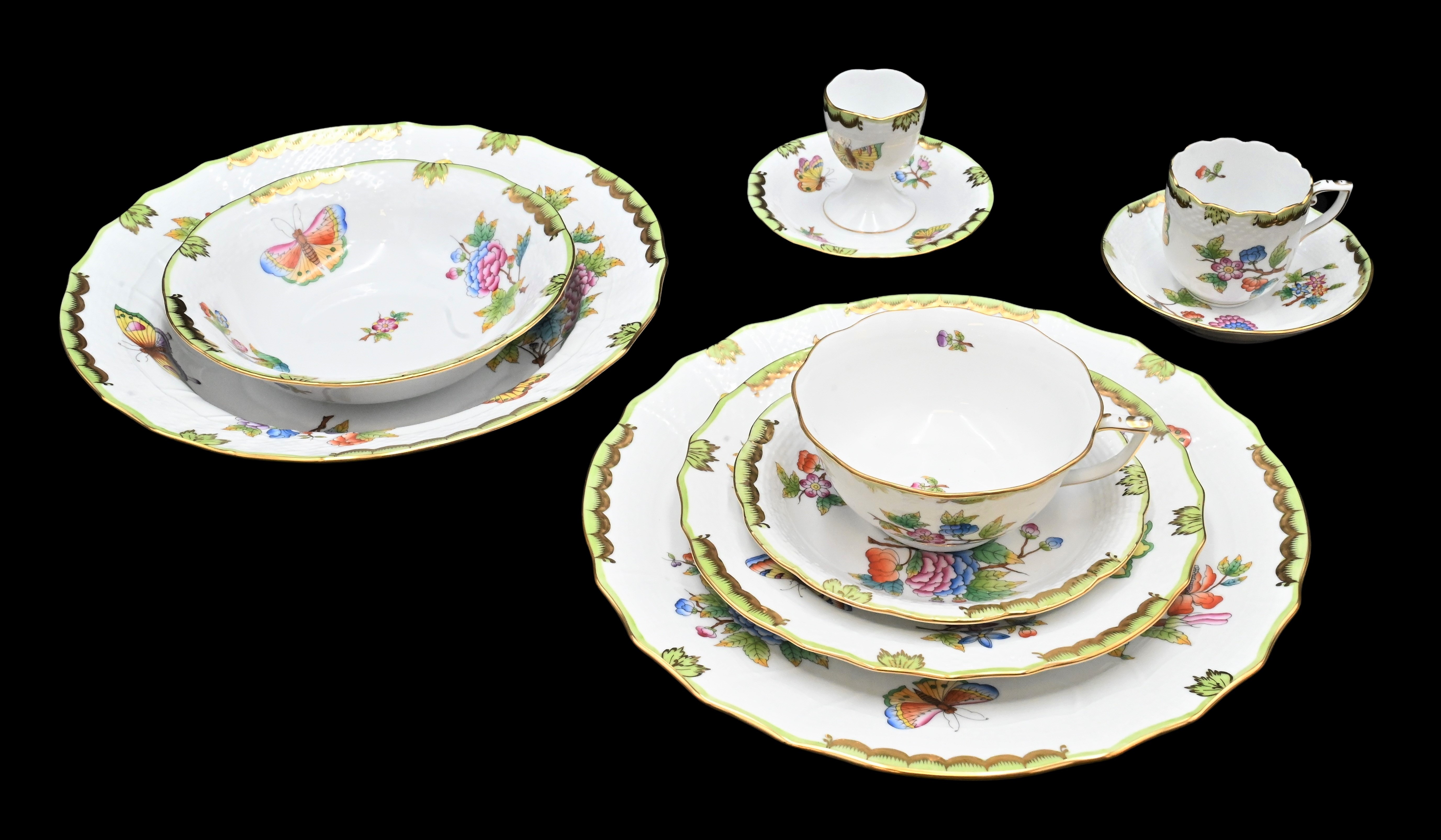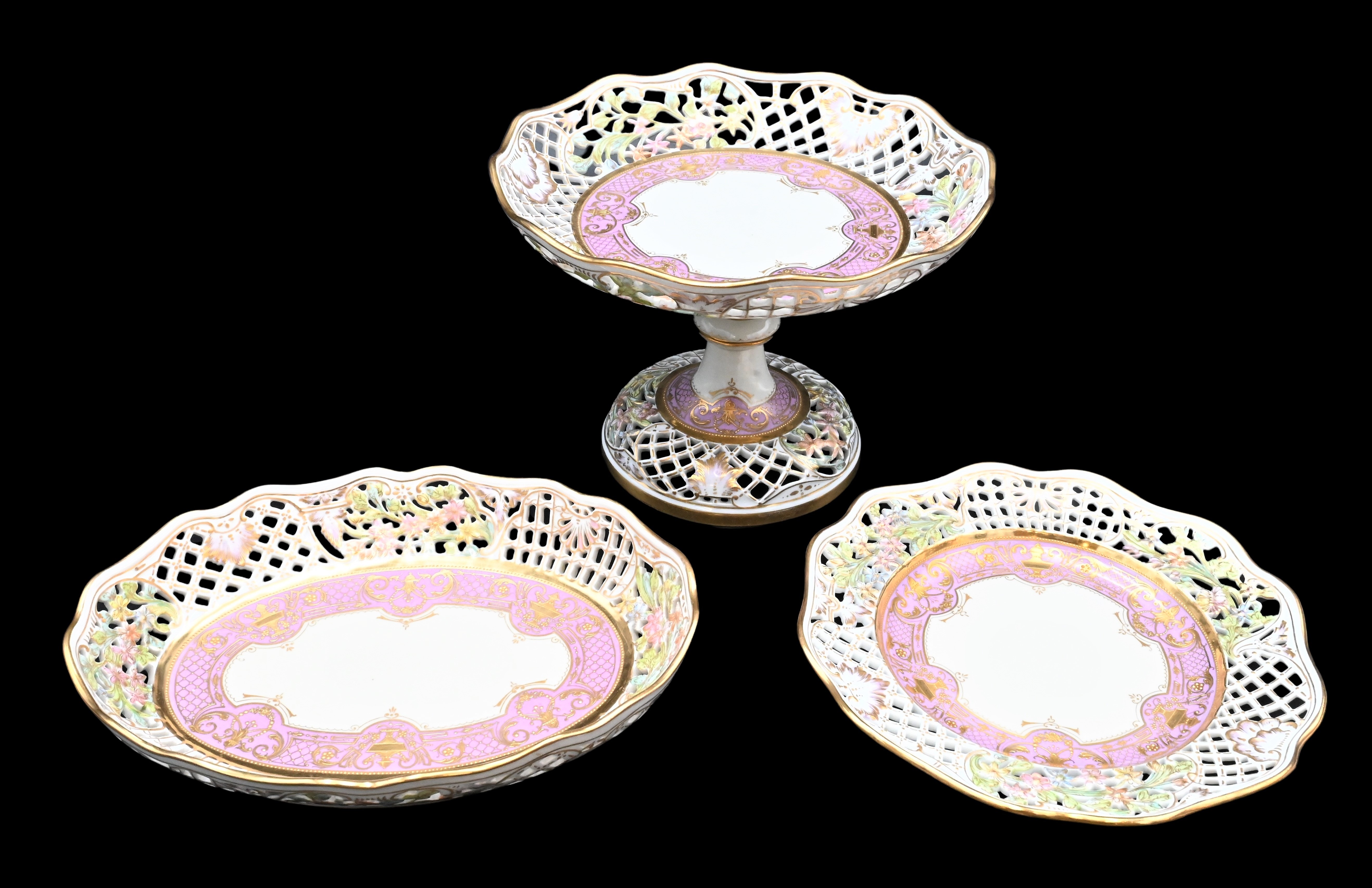 to include 12 plates, a pair of oval center bowls, along with a pair of compotes having reticulated border painted with flowers and having gilt gold decoration