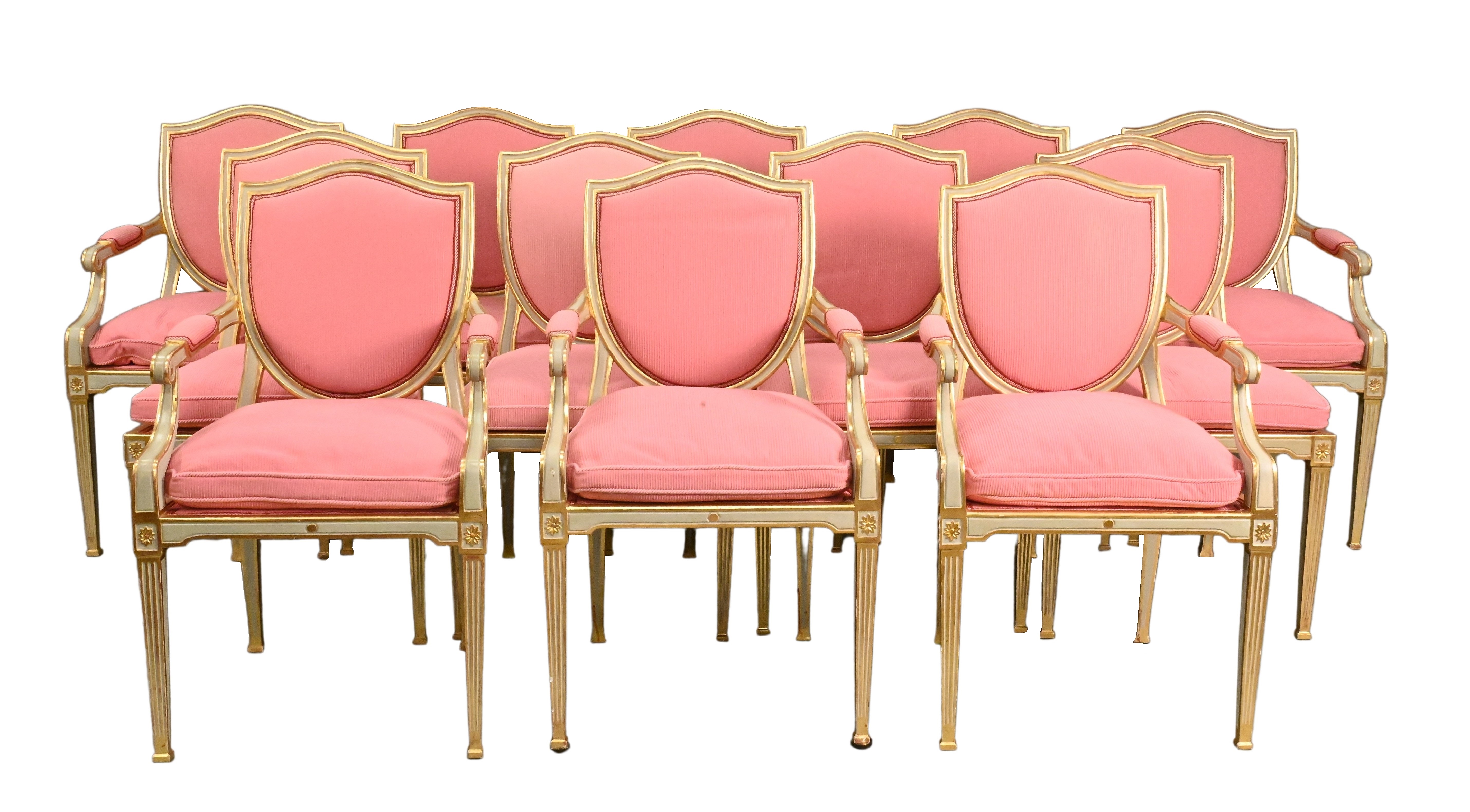 each having a shield-shaped back highlighted in gilt, along with cushioned seat covered in custom pink striped silk, on reeded square tapering legs, to include 8 open armchairs, 12 side chairs