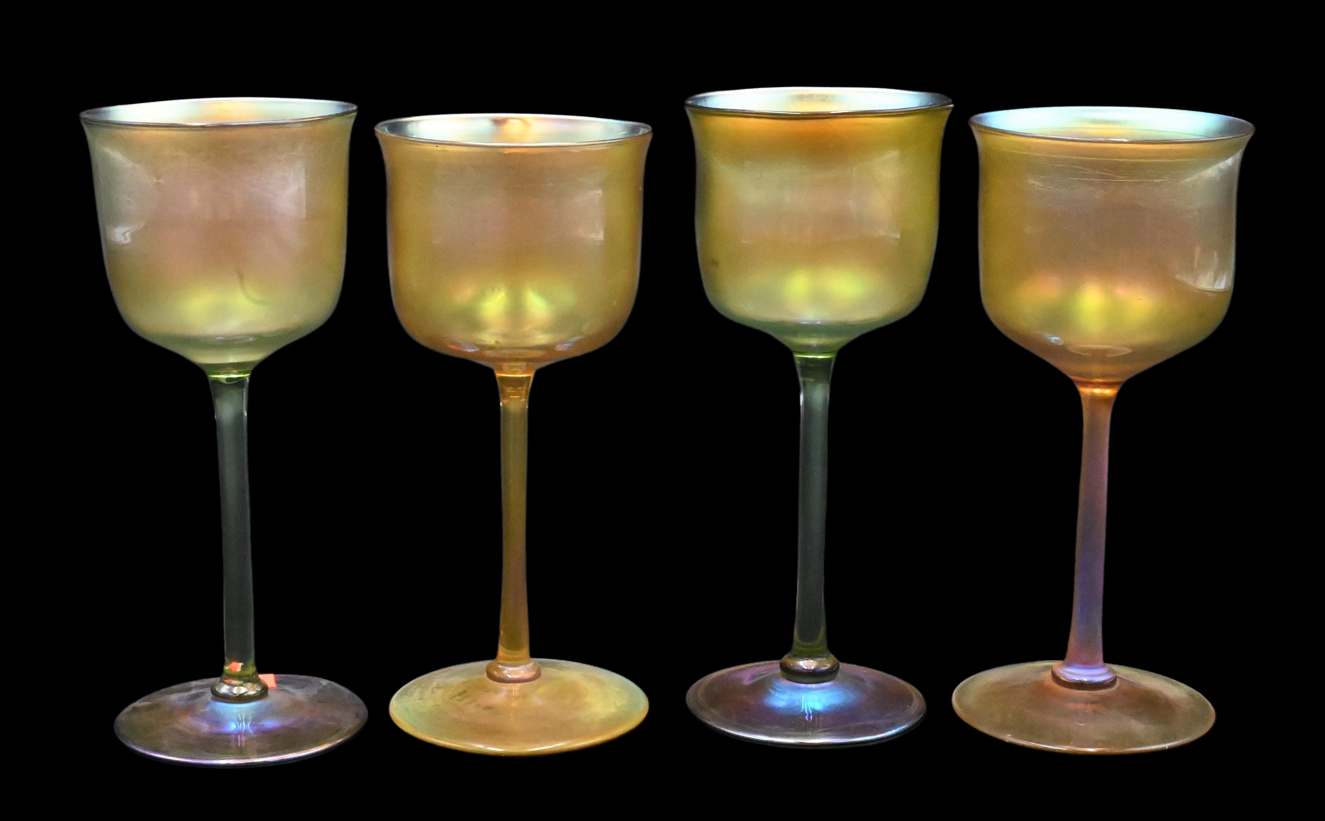 gold iridescent art glass, each base signed LCT and numbered, circa 1920, one having ruffled top edge