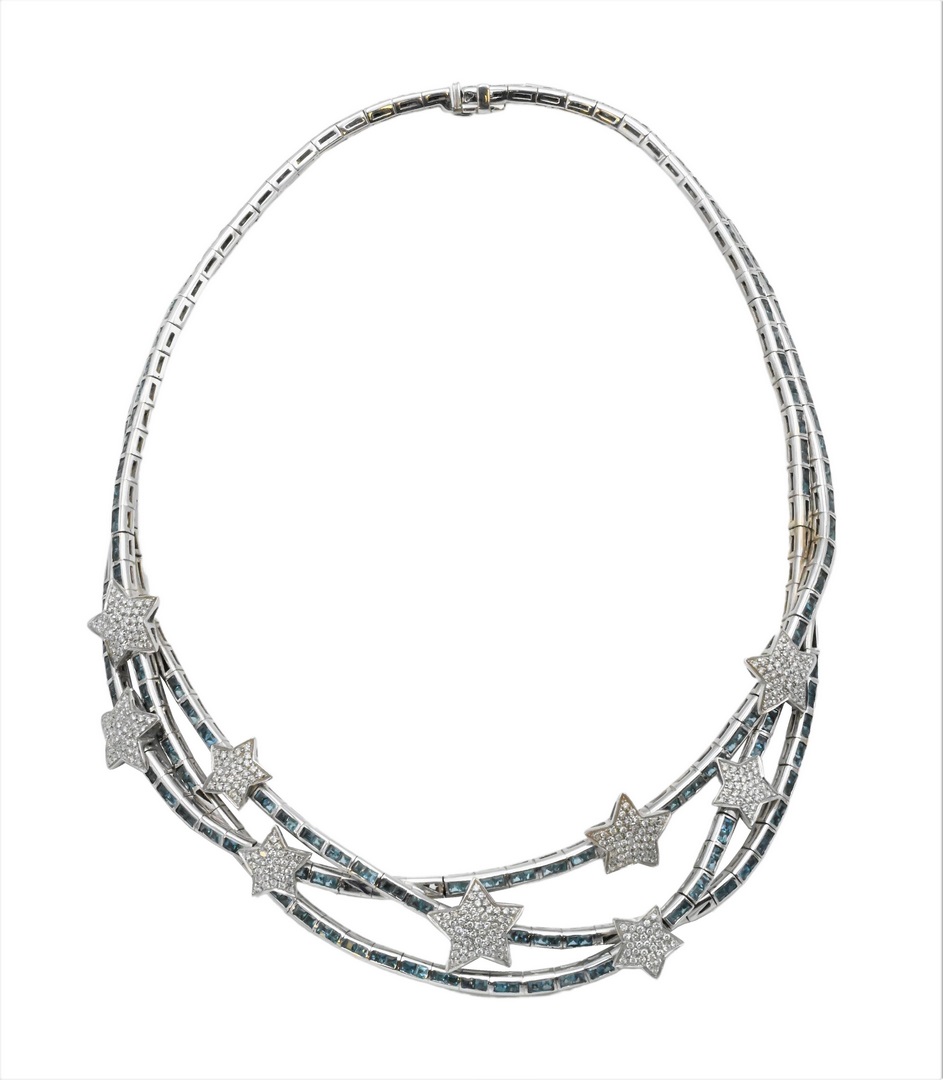 decorated with 54 baguette diamonds 4.30 carats and 82 round diamonds 1.86 carats,