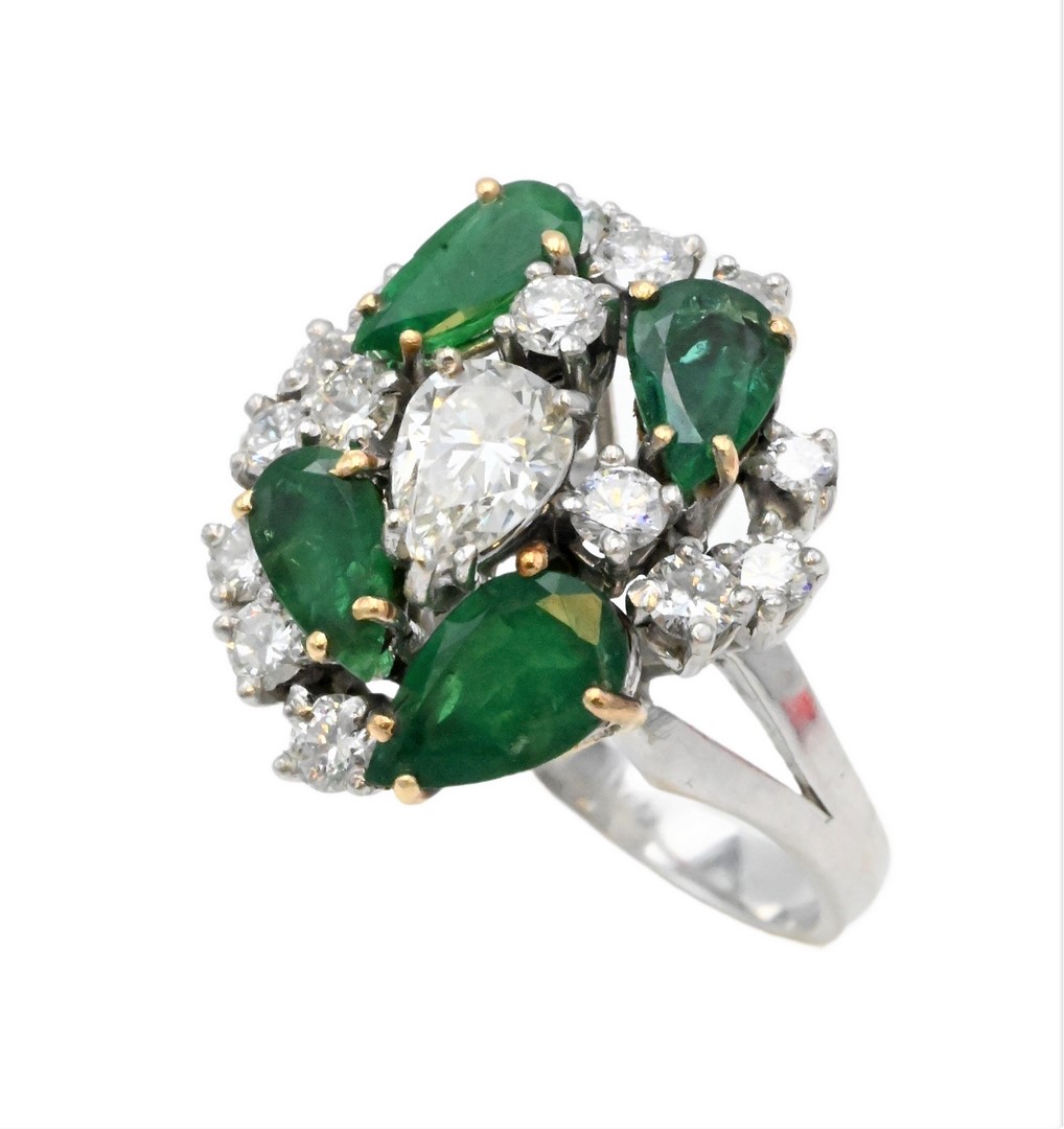 set with 19 diamonds, 1 pear shape, along with 4 pear shaped green stones