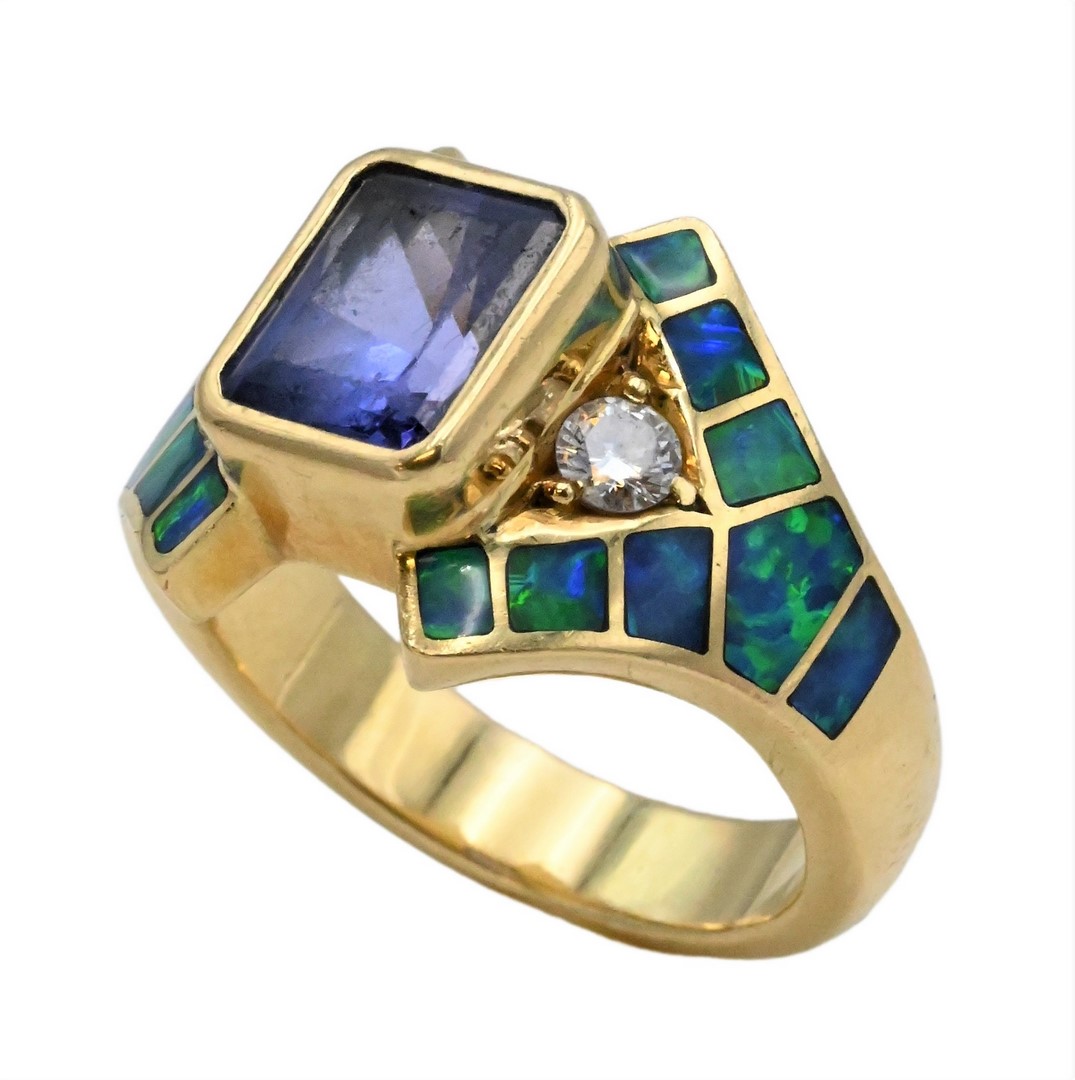 set with center tanzanite flanked by diamonds and inlaid with green stones