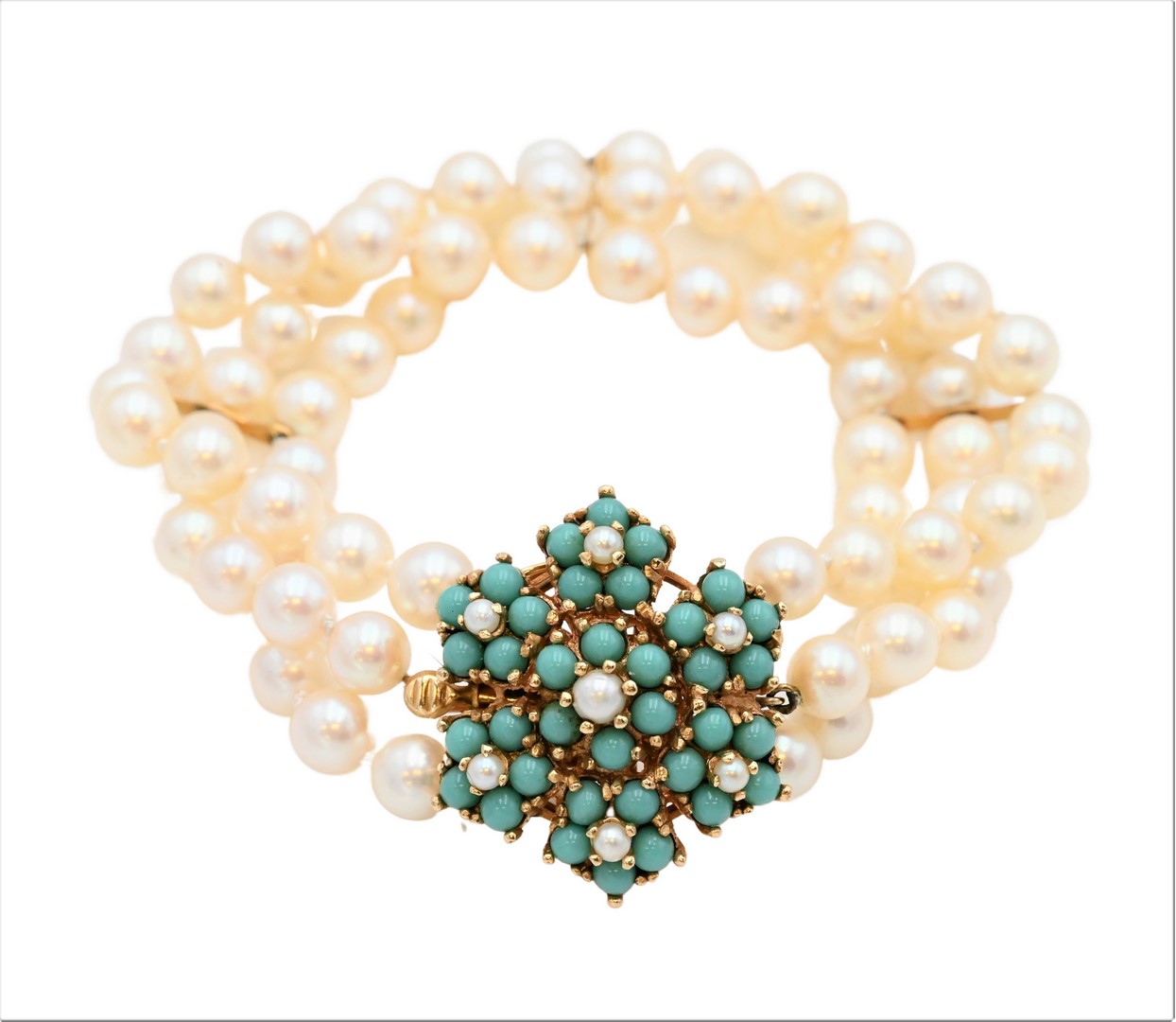 having large 14 karat yellow gold clasp set with turquoise and pearls