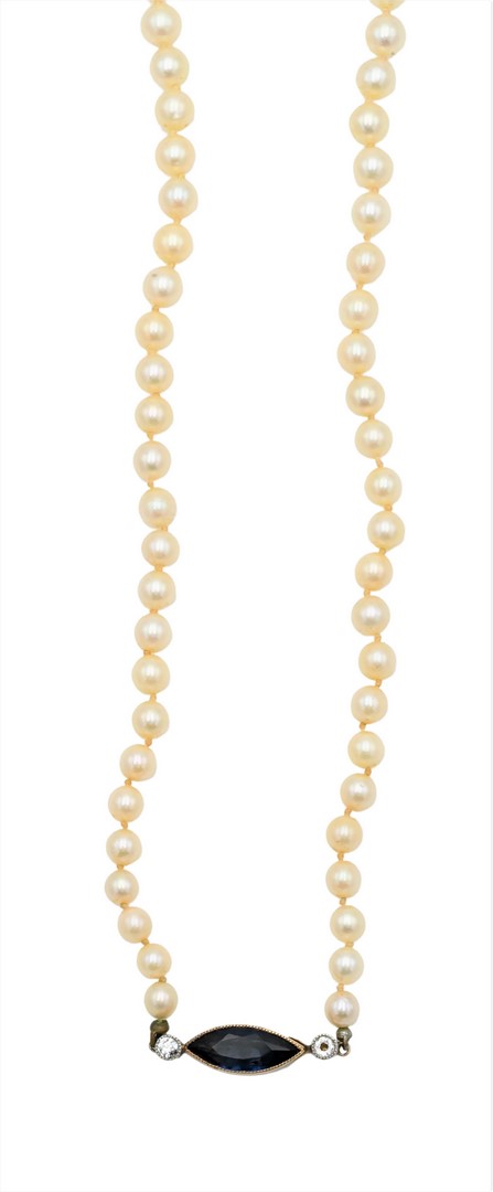 with graduated pearls, having gold clasp mounted with marquis blue sapphire along with two diamonds