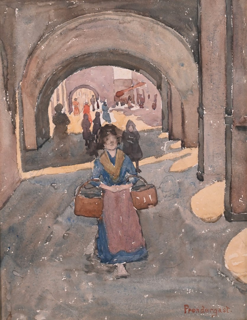 Exhibitions: New York, Kraushaar Galleries, Paintings by Glackens, Lawson, Prendergast, Sloan, September 20-October 17, 1953, n.p.,no.12 (as Portrait of a Girl), San Francisco, California, California Palace of the Legion of Honor, 1968-71, on loan, San Francisco California, California Palace of the Legion of Honor, Three Centuries of America Painting from the M.H. de Young Museum and the California Palace of Honor, December 19, 1970-February 7,1971, p. 103, no.39, Lot Notes: Signed “Prendergast” lower left image, 8 1/2″x5″ (21.6×12.7cm),