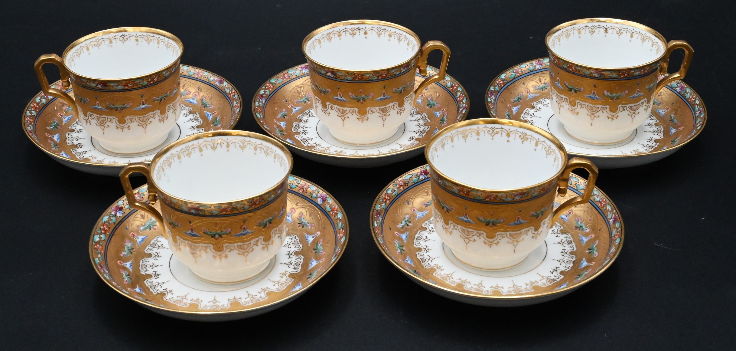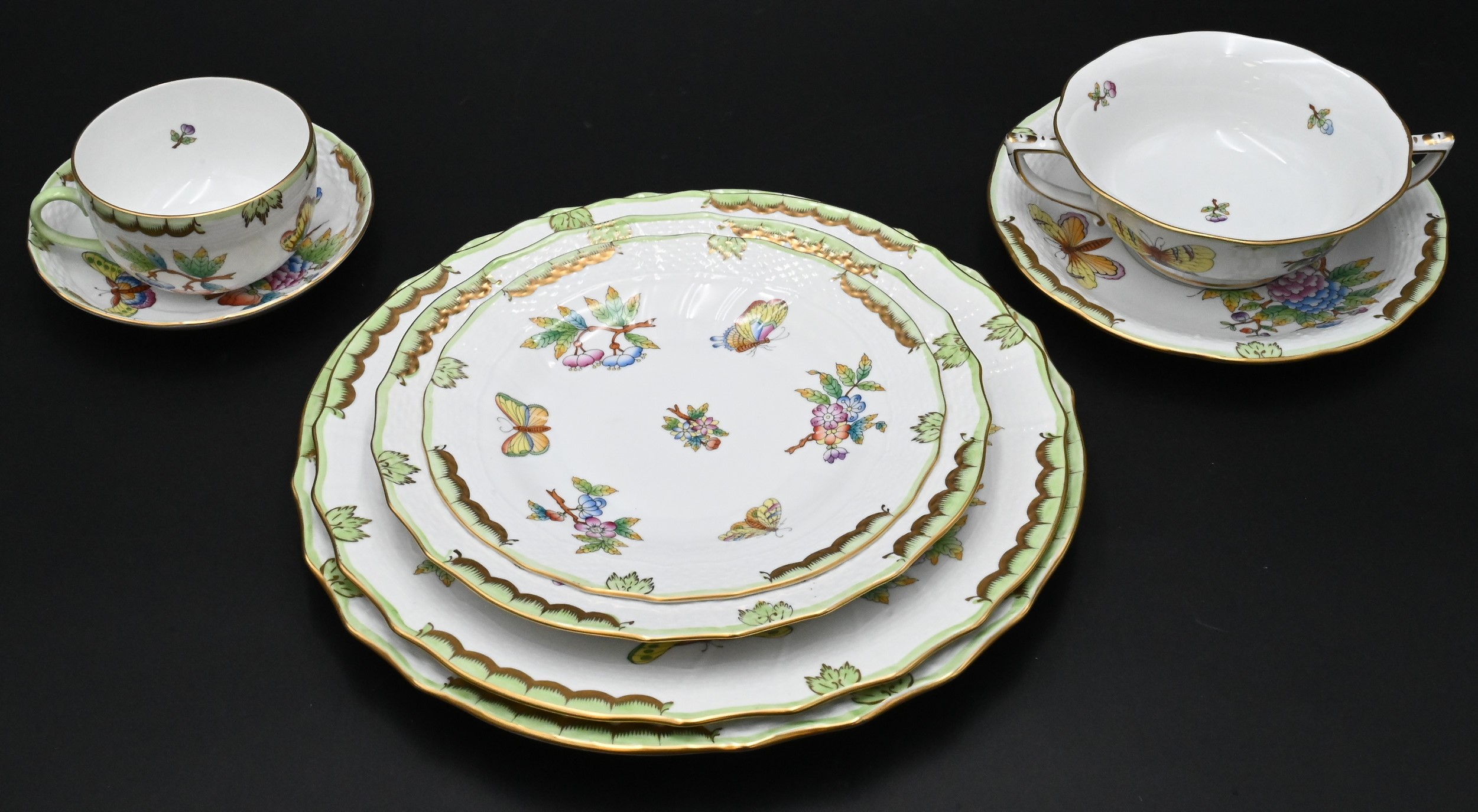 Condition: Many having chipping/losses to feet of dish, some minor gilt and paint loss throughout approximately eight bowls with either hairline cracks or chips, approximately nine plates with hairline cracks and chips, three of thr small tureens with either crack or loss, vegetable bowl having hairline crack, both large tureens having chips and hairline cracks, two 10 inch plates with chip to rim and crack to feet, one 13 3/4 inch platter having large crack and repair, other 13 3/4 inch platter having small crack to feet, 15 1/2 inch platter having soiling and craqueleur, 17 inch platter with firing imperfection around feet