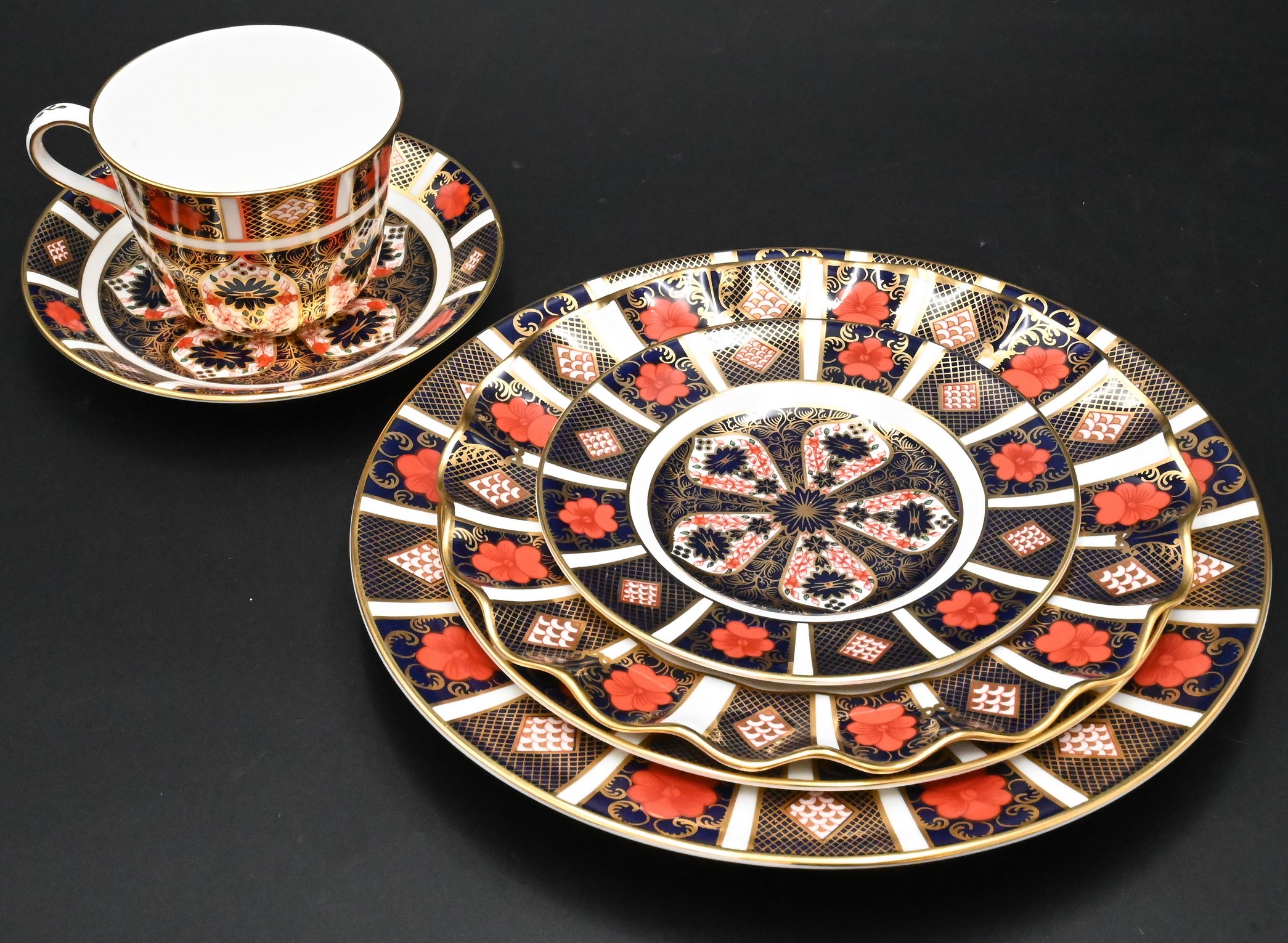 in similar versions of Imari inspired pattern, late 19th/early 20th century, to include 30 soup plates (10 inches), 23 luncheon plates (9 1/2 inches), 30 dinner plates (10 1/4 inches), pair of rectangular soup tureens with covers (each 12 3/4 inches long), fout square entree dishes with covers (each 10 1/4 inches long), three rectangular sauce tureens with covers an stands (length 7 1/4 inches each, width 5 1/2 inches each), one open two handled vegetable bowl (height 3 3/4 inches eachwidth 12 1/2 inches each), one large platter (length 20 1/8 inches, width 16 inches), two 17 inch rectangular platters, two 15 1/4 inch rectangular platters, two 13 3/4 inch rectangular platters, four 11 1/2 inch rectangular platters, four 10 inch rectangular platters, four 8 1/2 inch rectangular platters