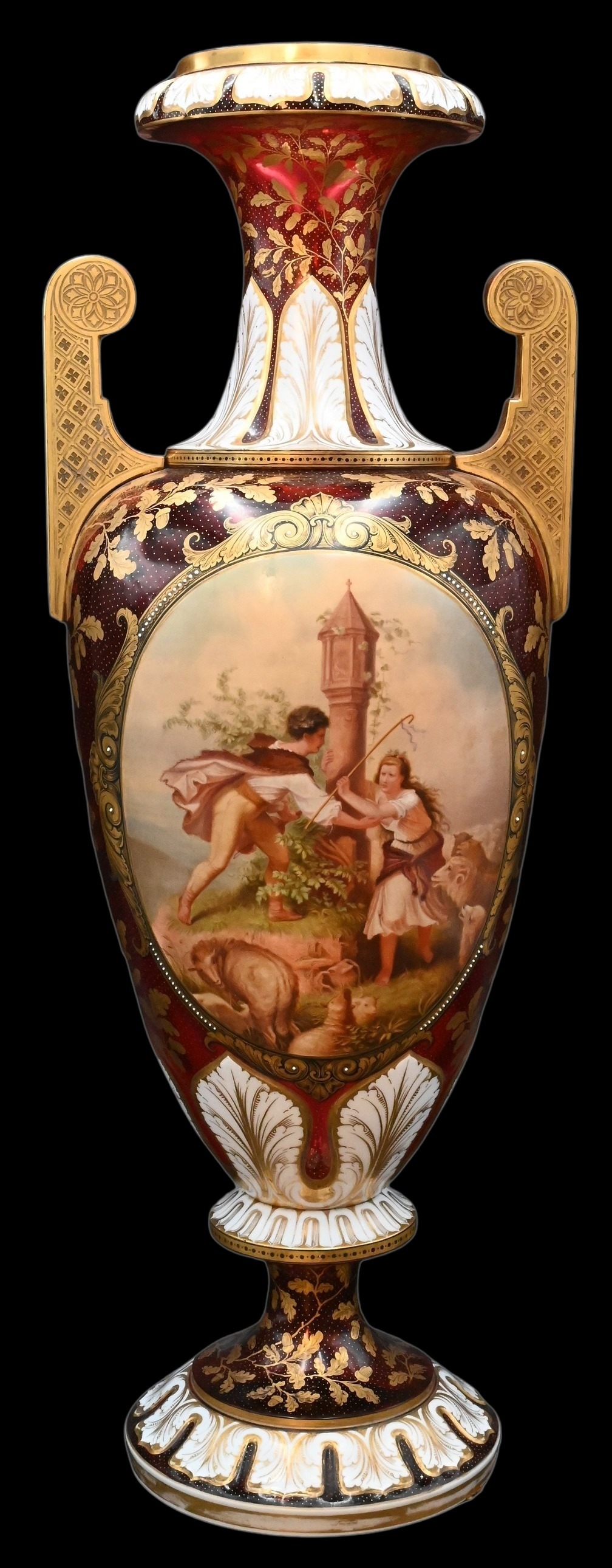 having applied gilt porcelain handles and oval pattern scene of man and shepherdess with her sheep, two parts having small vase insert