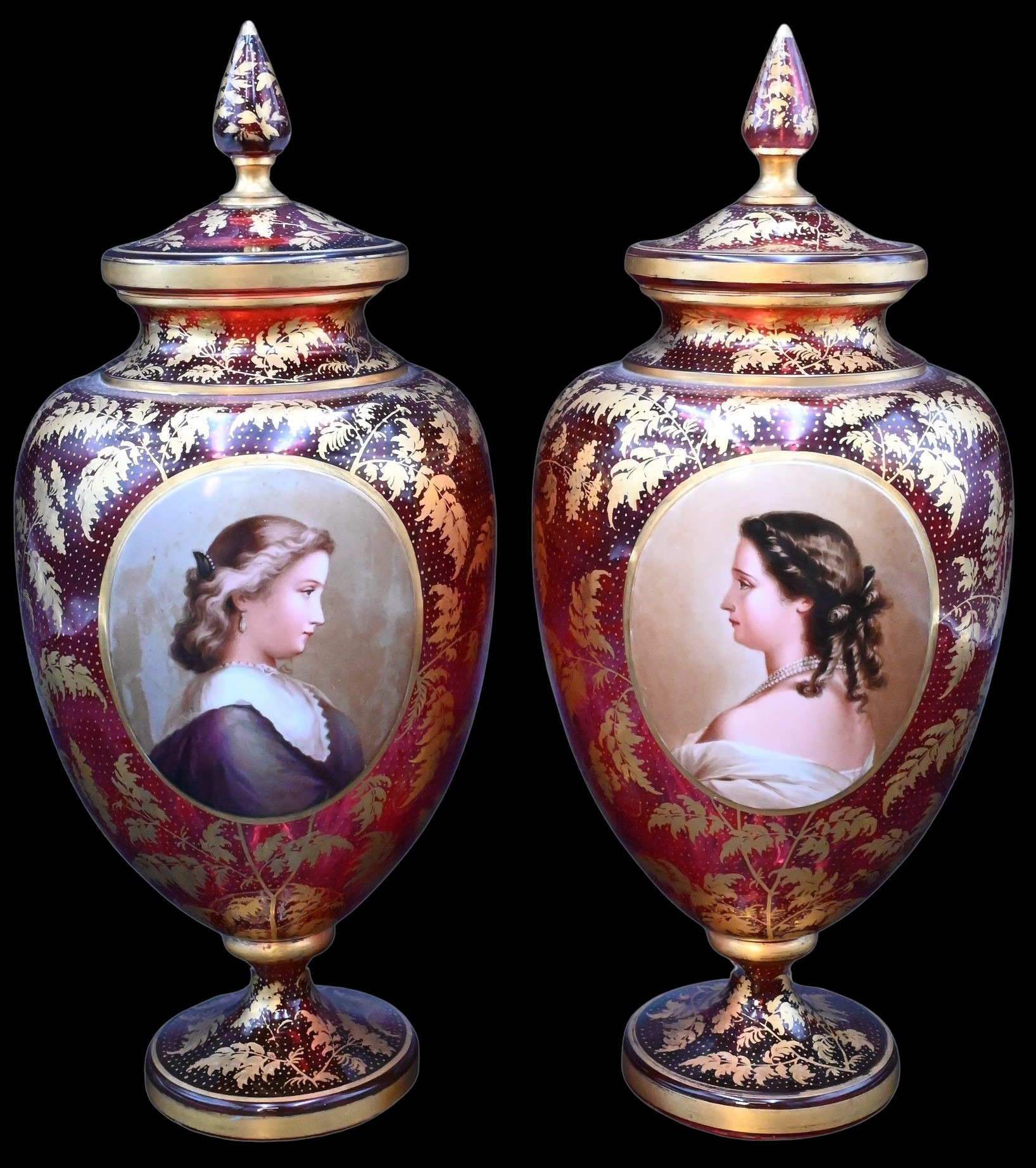 each having finial tops and gilt decorated bodies with oval porcelain female portrait panels, set on round footed base