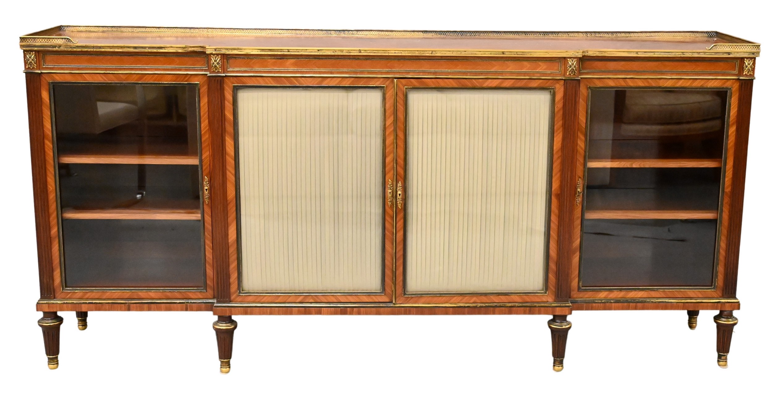 having pierced metal gallery top, four glass paneled doors flanked by fluted pilasters bronze mounts, 19th century